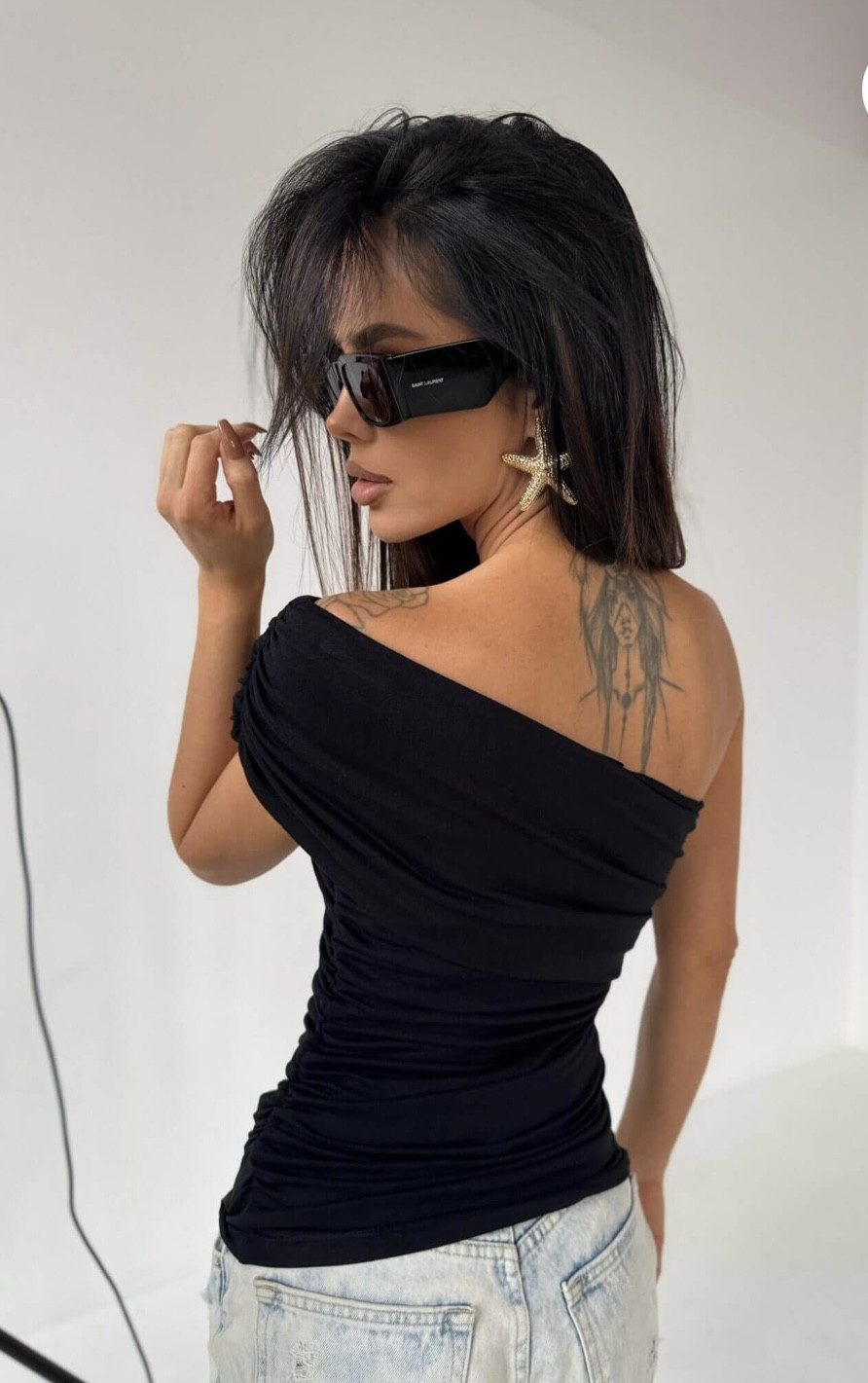 Asymetryczny krój z marszczeniem na jednym ramieniu tworzy ciekawy, nowoczesny detal, który dodaje charakteru i przyciąga spojrzenia. Top wyróżnia się prostotą w luksusowym wydaniu – doskonały zarówno na co dzień, jak i na wieczorne wyjście.
