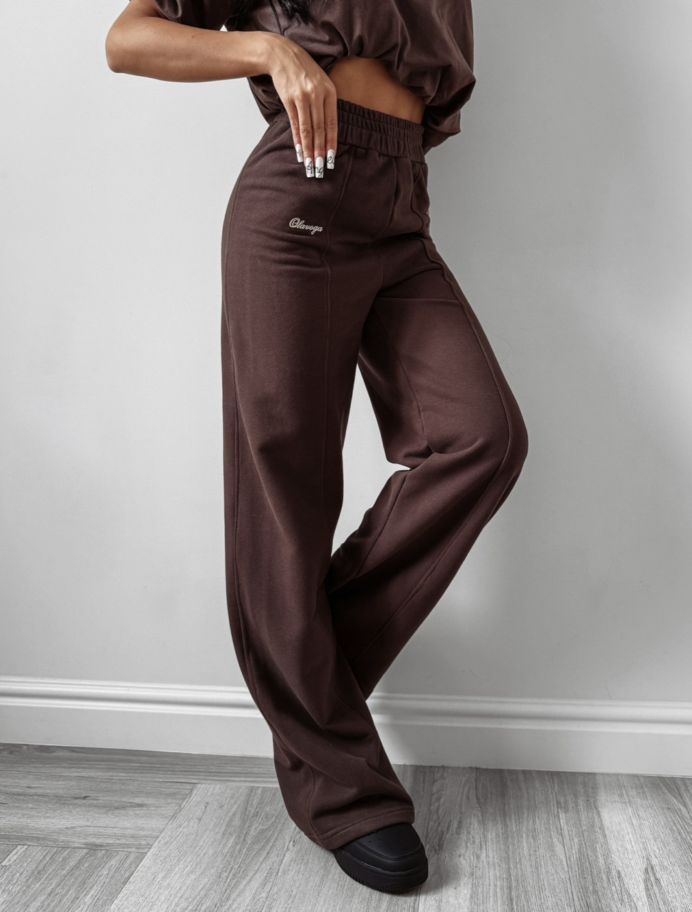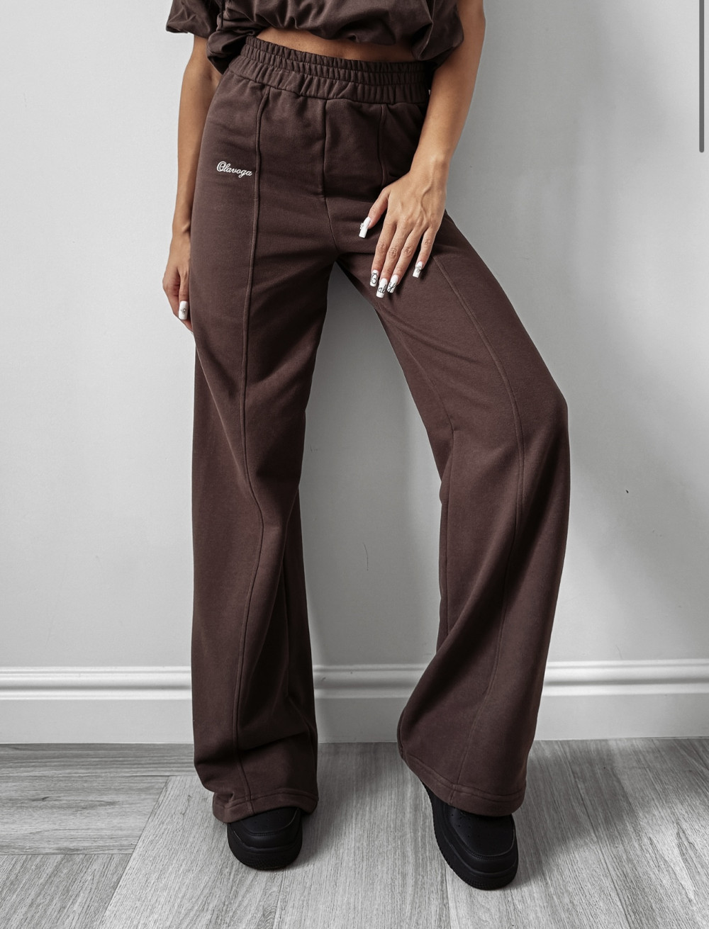 Model posiada gumę w talii, dzięki czemu idealnie dopasowuje się do sylwetki, a rozszerzane nogawki nadają całości nowoczesny i modny charakter. Przeszycia podkreślają staranne wykończenie, a subtelny haft z logo marki OLAVOGA umieszczony z boku dodaje całości luksusowego akcentu.