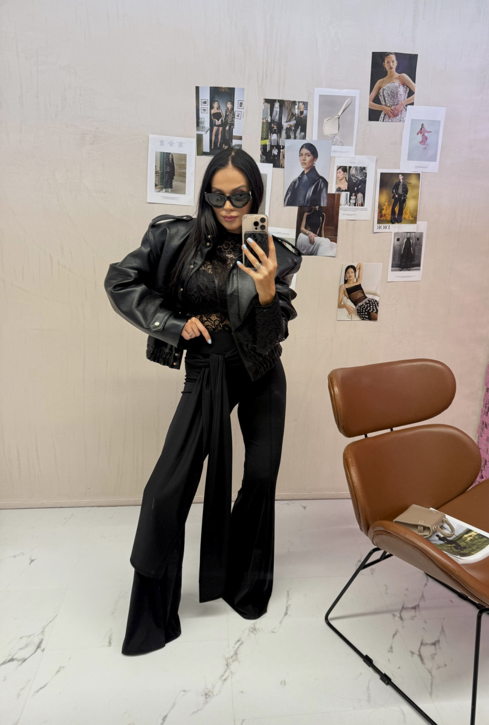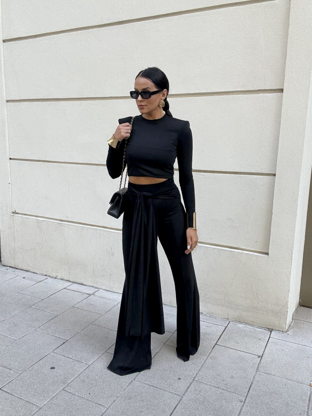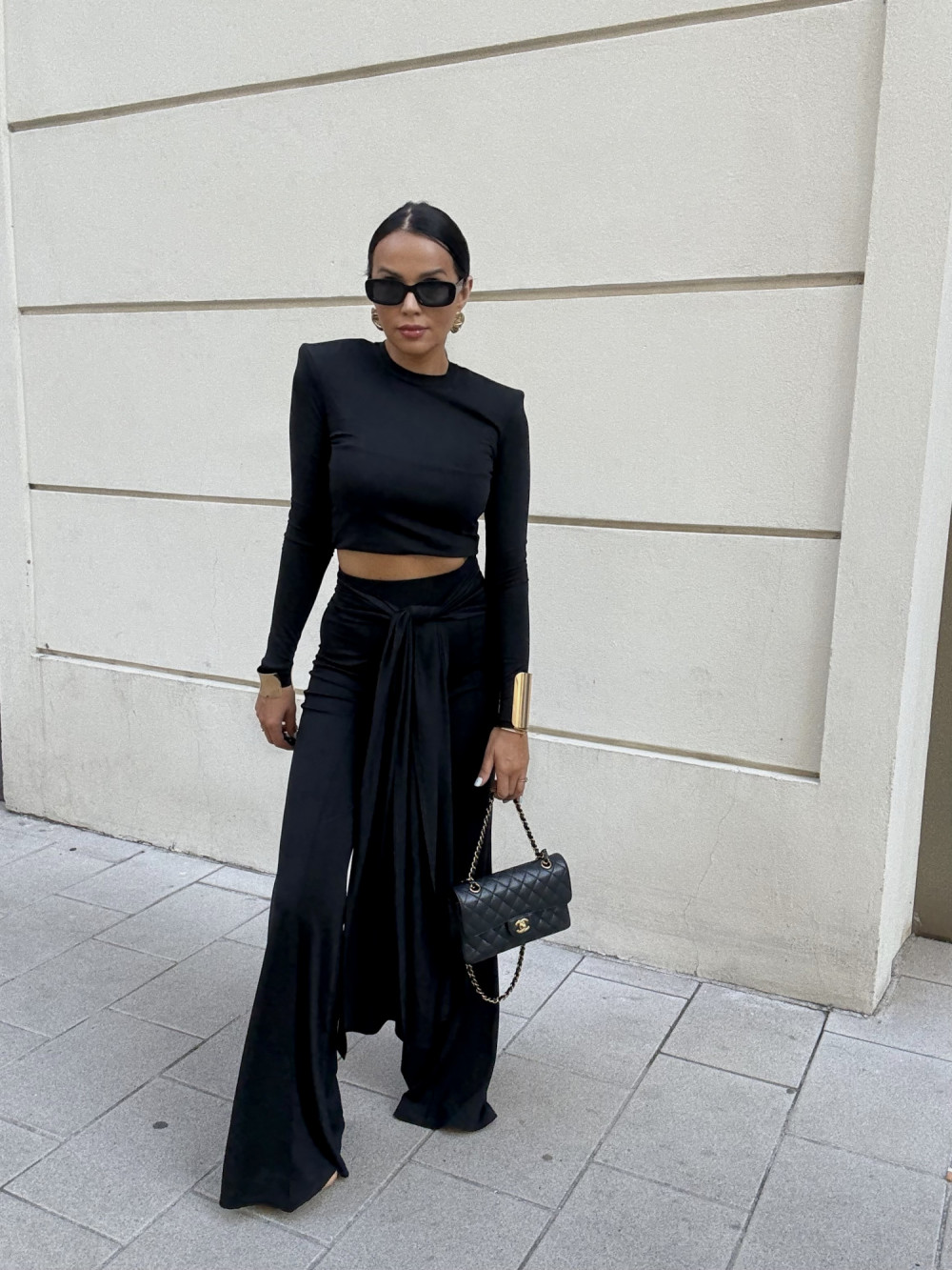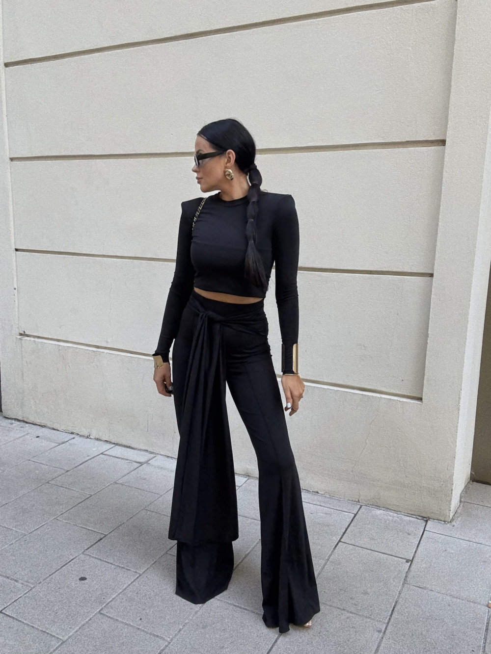 Dzięki klasycznej czerni spodnie są niezwykle uniwersalne – możesz nosić je w eleganckim zestawie z naszym czarnym topem z poduszkami w ramionach, tworząc pełny look z charakterem, lub w bardziej casualowych stylizacjach z prostym t-shirtem.