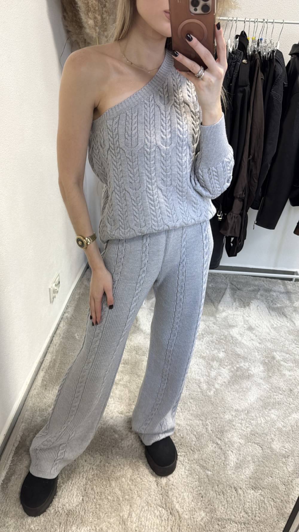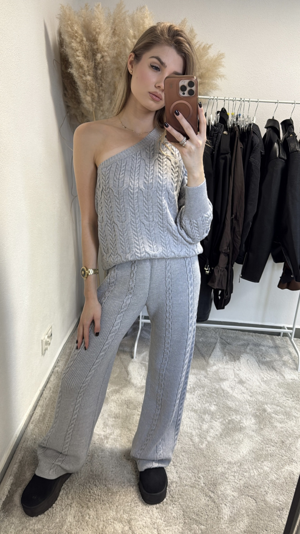 Stylowy i komfortowy komplet sweterkowy La Milla w odcieniu eleganckiej szarości to propozycja, która łączy wygodę z najnowszymi trendami. Zestaw składa się z topu na jedno ramię oraz spodni o luźnym, lekko rozszerzanym kroju. Wykonany z miękkiej dzianiny o charakterystycznym splocie w warkoczowy wzór, zapewnia nie tylko ciepło, ale i efektowny wygląd.