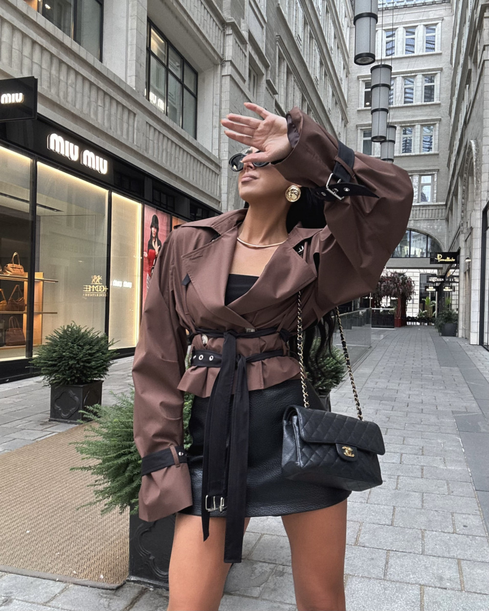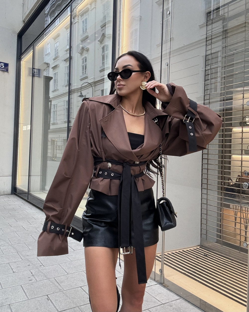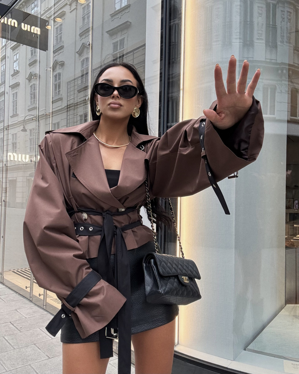 Krótki brązowy trencz La Milla to nowoczesna interpretacja klasyki. Model o lekko oversize’owym kroju wyróżnia się szerokimi rękawami z regulowanymi paskami oraz wiązaniem w talii, które pięknie podkreśla sylwetkę. Wyraziste detale w postaci kontrastowych, czarnych wstawek nadają mu modowego charakteru i sprawiają, że każda stylizacja zyskuje unikatowy akcent. Idealny do skórzanej spódnicy, jeansów czy eleganckich spodni — sprawdzi się zarówno w stylizacjach codziennych, jak i wieczorowych.