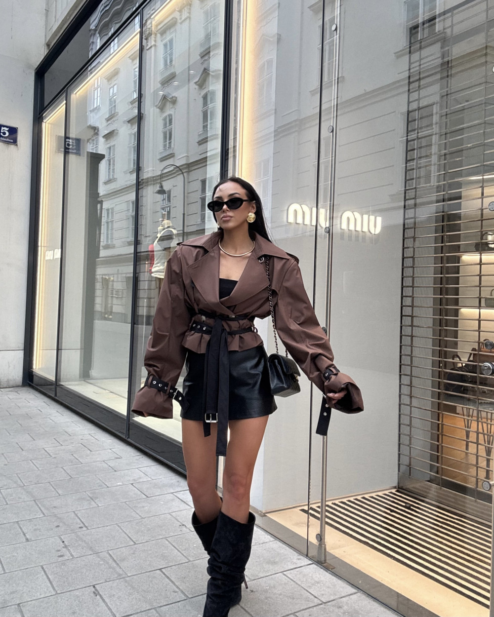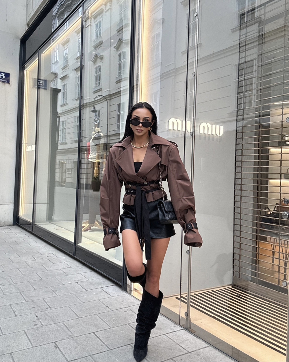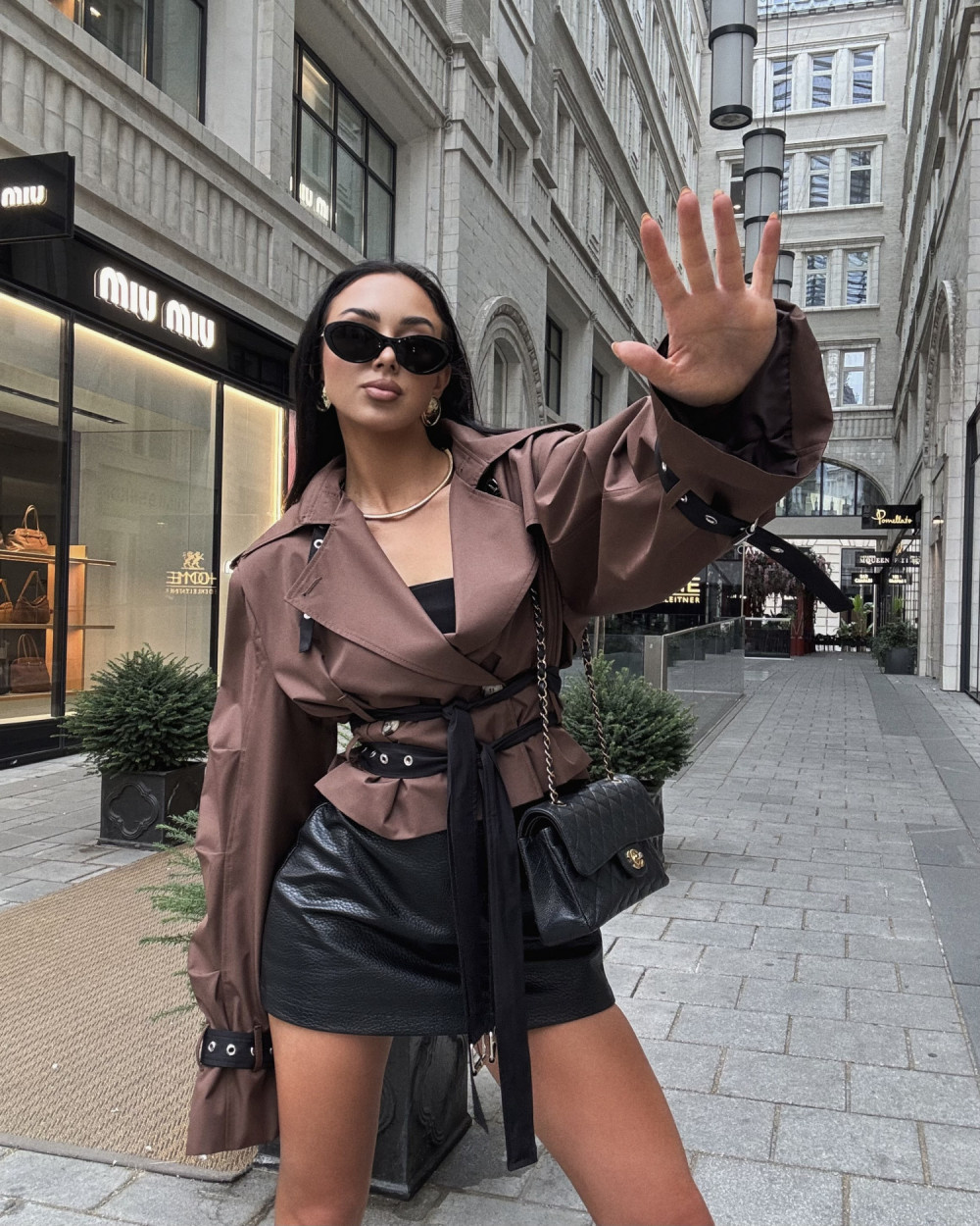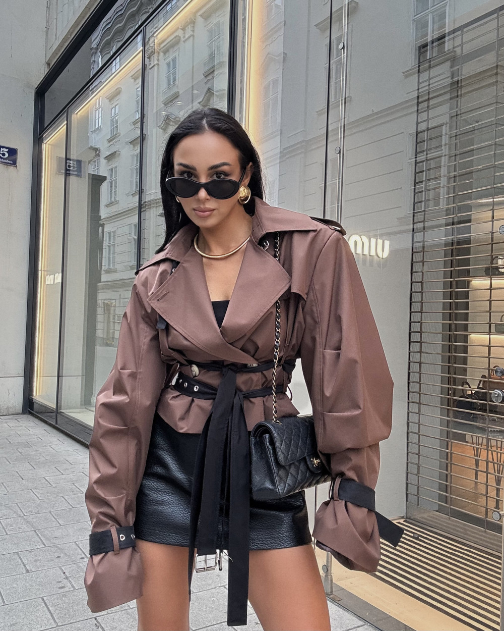 Krótki brązowy trencz La Milla to nowoczesna interpretacja klasyki. Model o lekko oversize’owym kroju wyróżnia się szerokimi rękawami z regulowanymi paskami oraz wiązaniem w talii, które pięknie podkreśla sylwetkę. Wyraziste detale w postaci kontrastowych, czarnych wstawek nadają mu modowego charakteru i sprawiają, że każda stylizacja zyskuje unikatowy akcent. Idealny do skórzanej spódnicy, jeansów czy eleganckich spodni — sprawdzi się zarówno w stylizacjach codziennych, jak i wieczorowych.