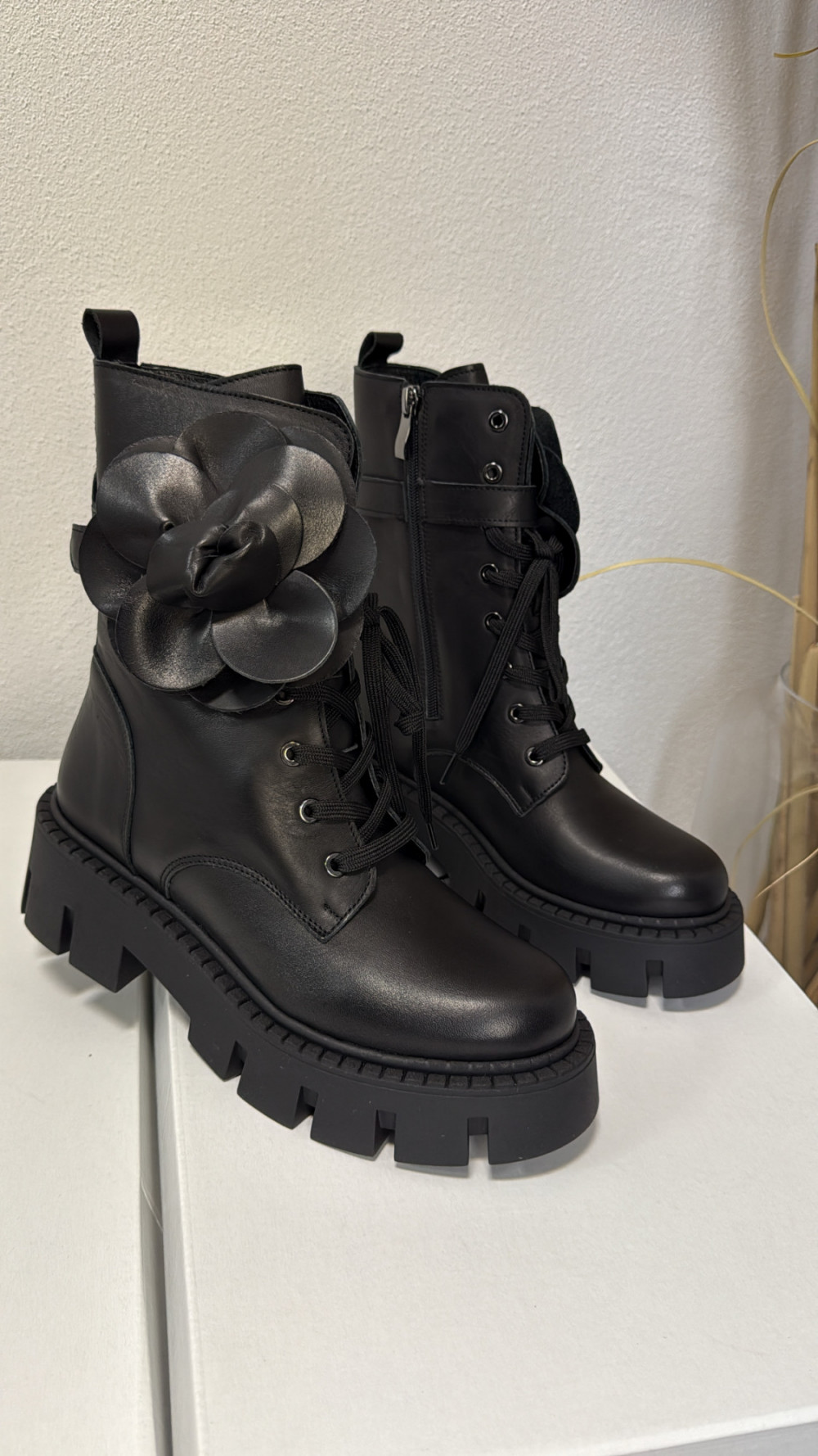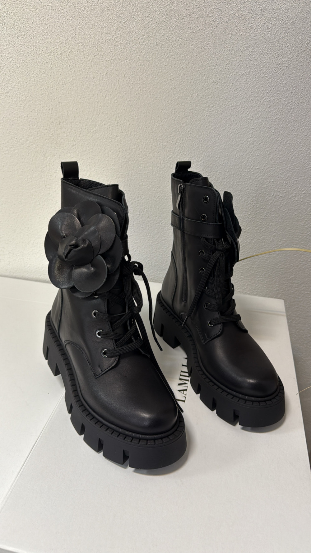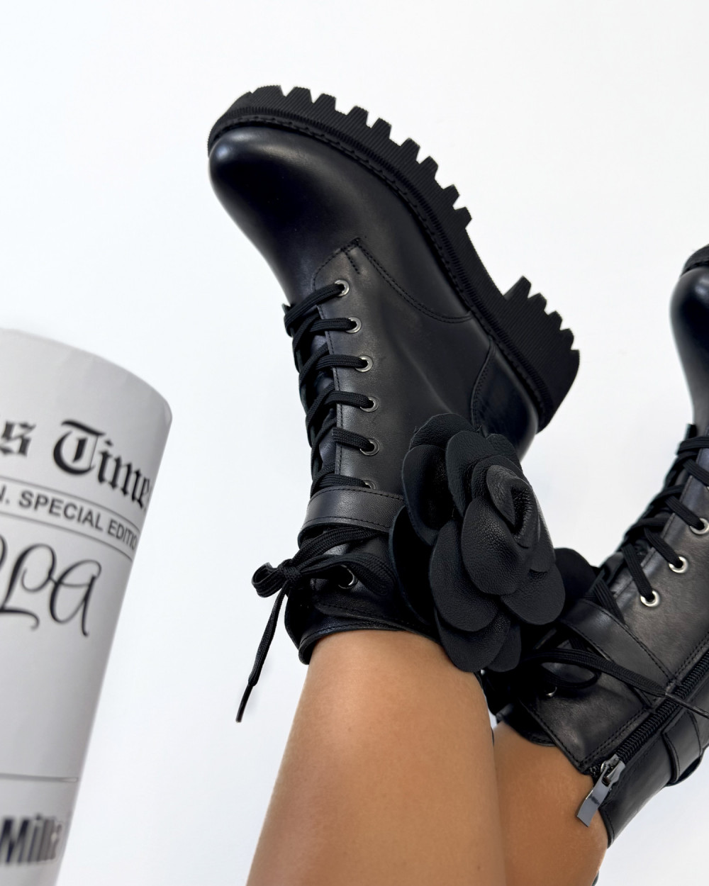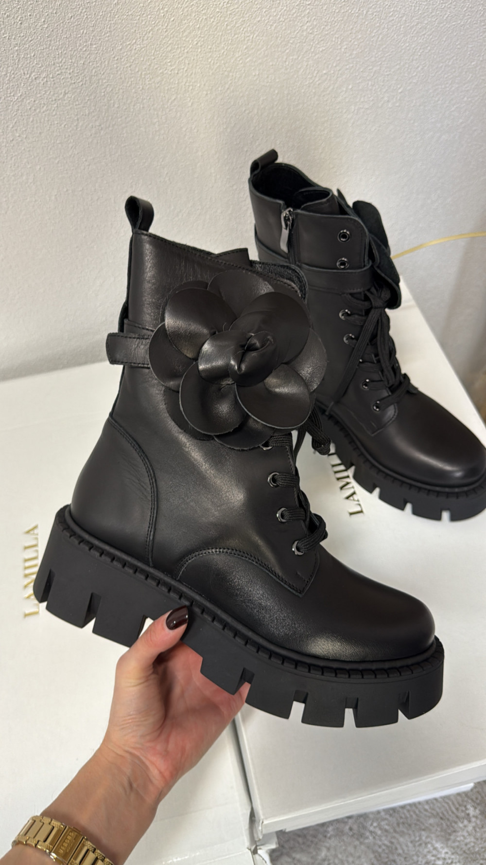 Czarne botki z kwiatem ze skóry naturalnej La Milla