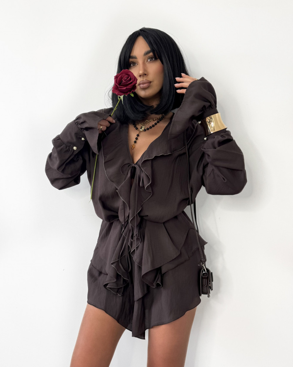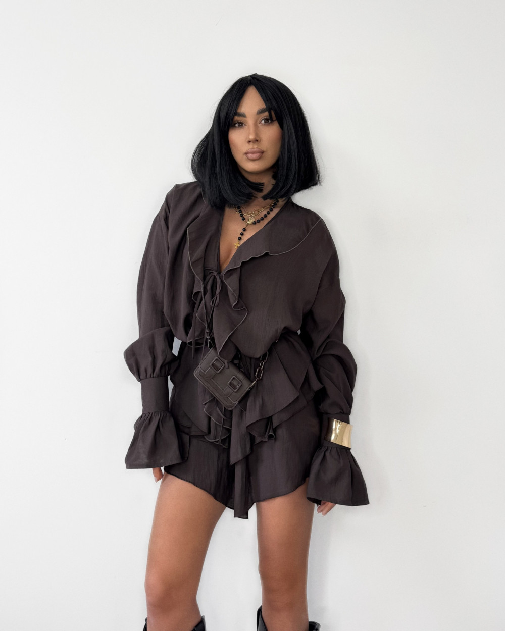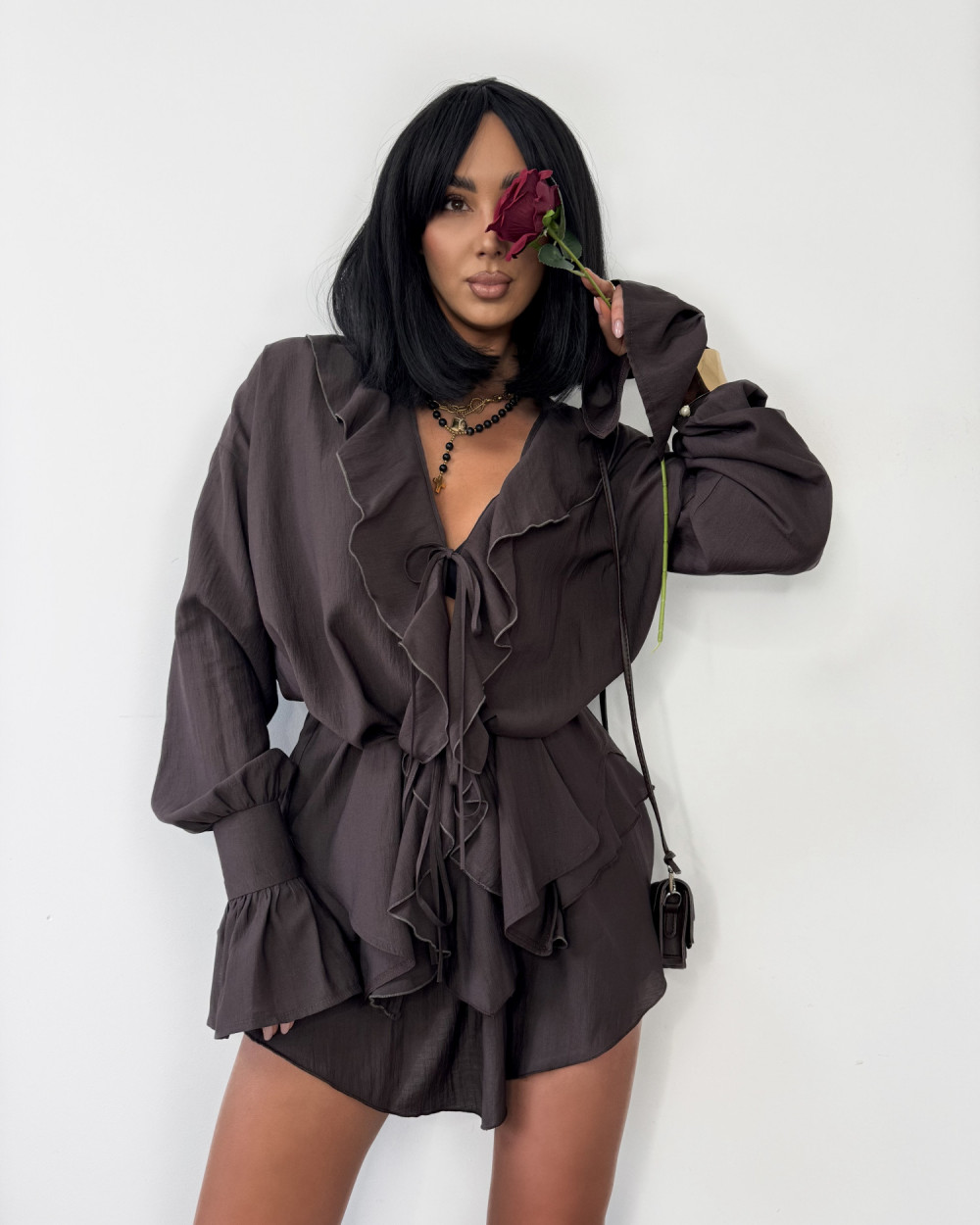 Czekoladowy komplet La Milla to idealne połączenie kobiecości i nowoczesnego stylu. Wykonany z lekkiego, zwiewnego materiału, pięknie układa się na sylwetce i gwarantuje pełen komfort noszenia. Górna część zachwyca efektownymi falbanami i wiązaniem przy dekolcie, które dodają całości romantycznego, ale zarazem modowego charakteru.