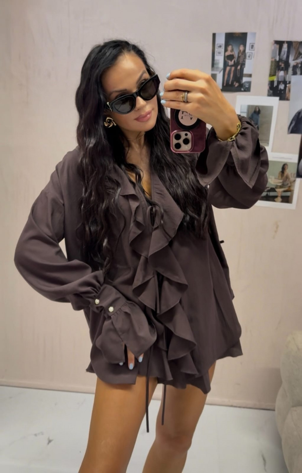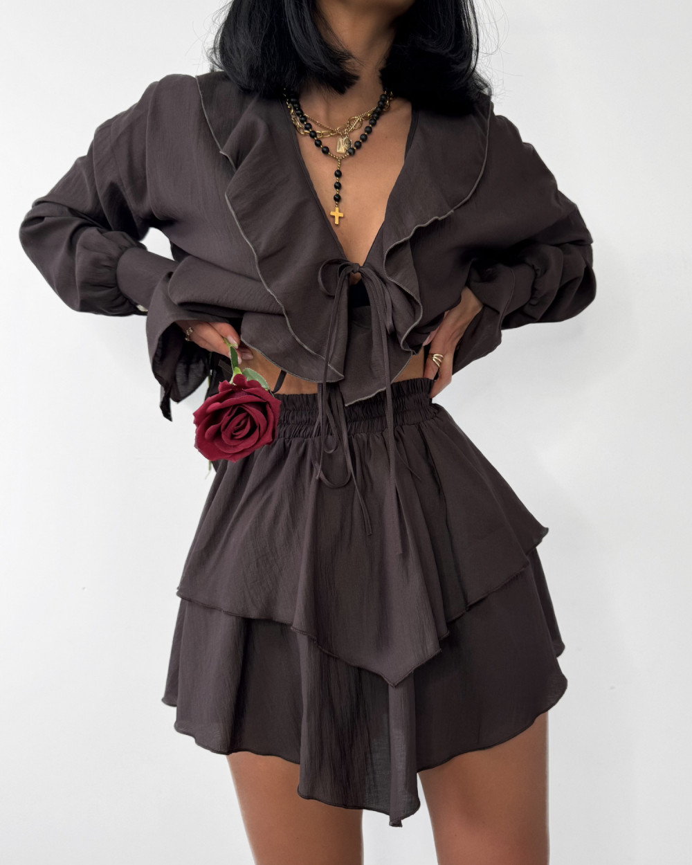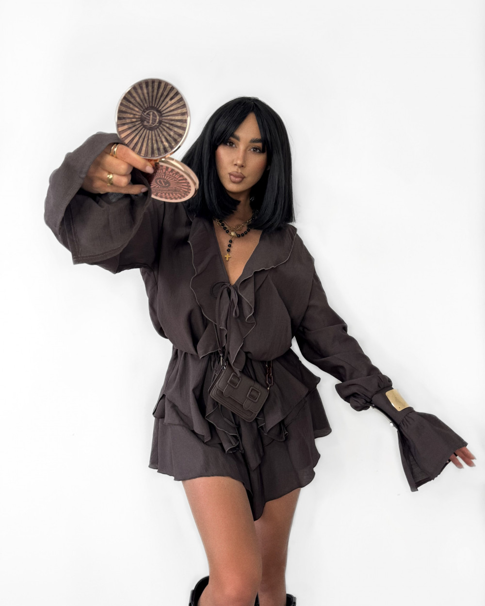 Czekoladowy komplet La Milla to idealne połączenie kobiecości i nowoczesnego stylu. Wykonany z lekkiego, zwiewnego materiału, pięknie układa się na sylwetce i gwarantuje pełen komfort noszenia. Górna część zachwyca efektownymi falbanami i wiązaniem przy dekolcie, które dodają całości romantycznego, ale zarazem modowego charakteru.
