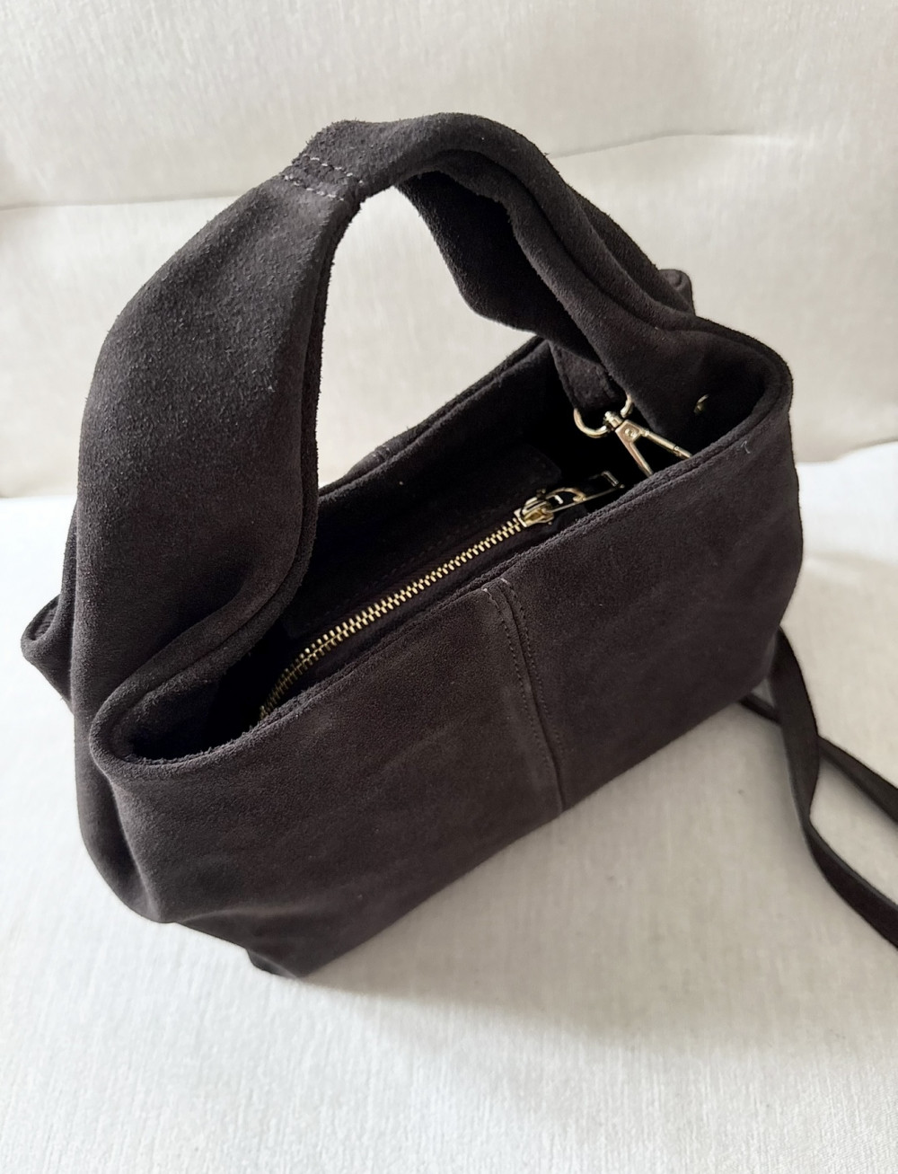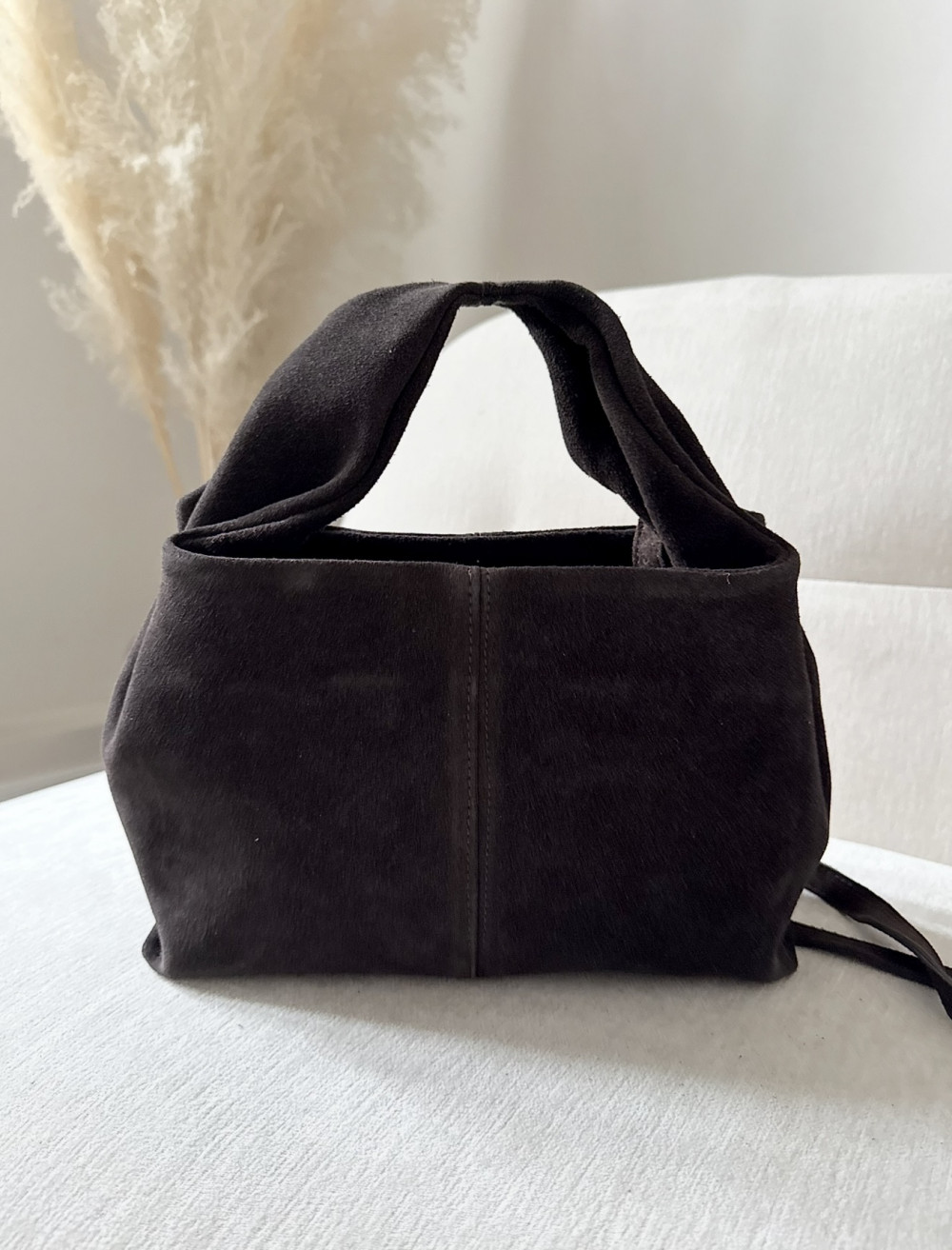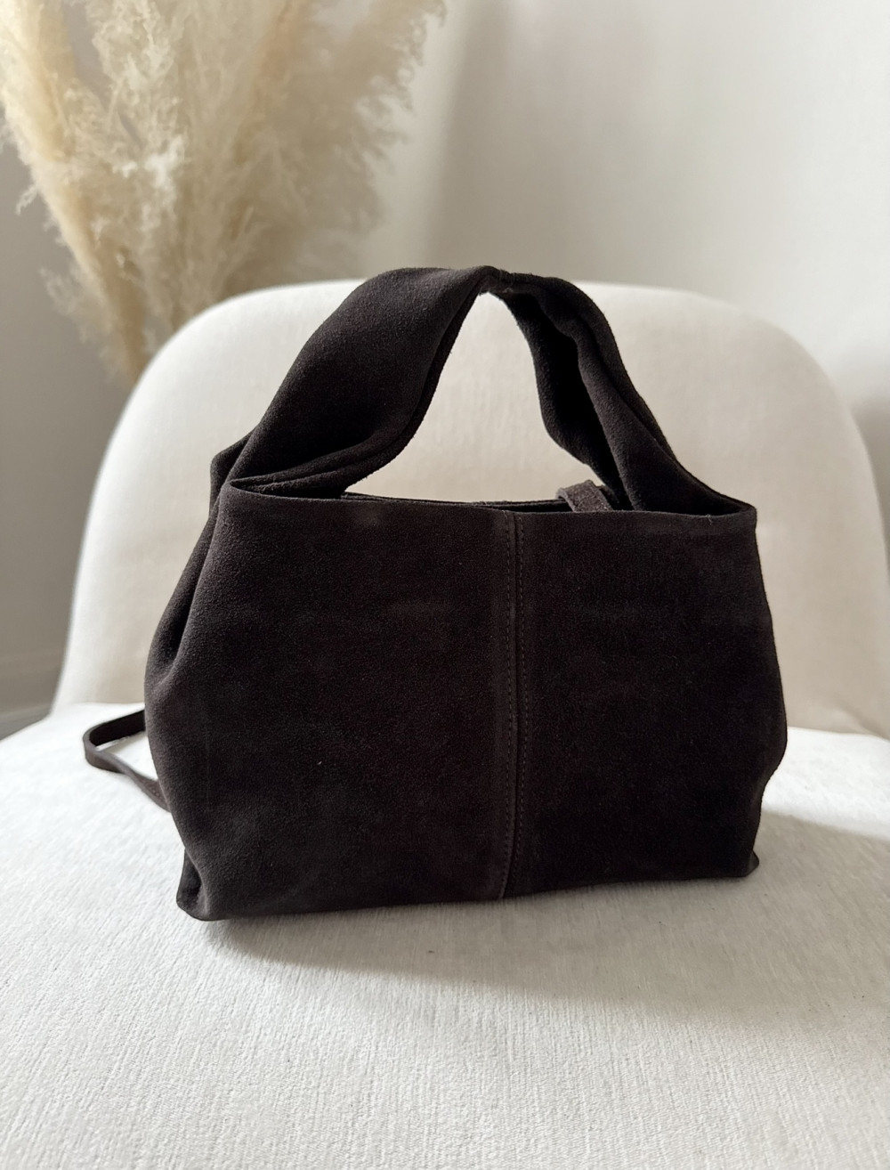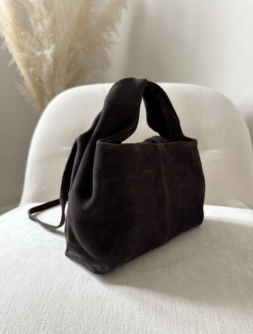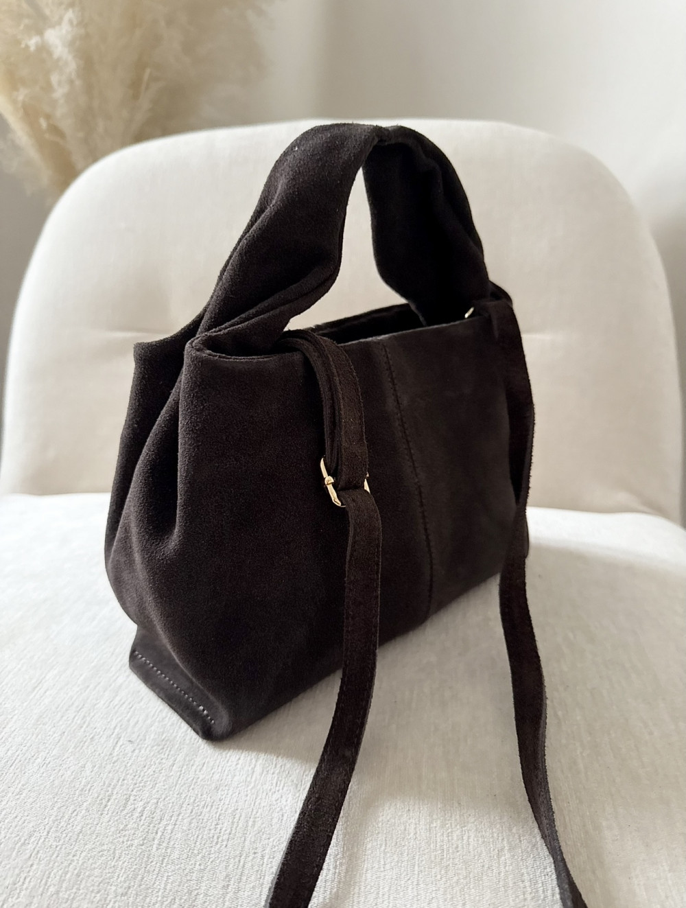 Torebka Adele to klasyczny model wykonany z miękkiej skóry zamszowej w odcieniu głębokiej czekolady. Jej prosta forma i elegancki minimalizm sprawiają, że doskonale komponuje się zarówno z codziennymi, jak i bardziej formalnymi stylizacjami.