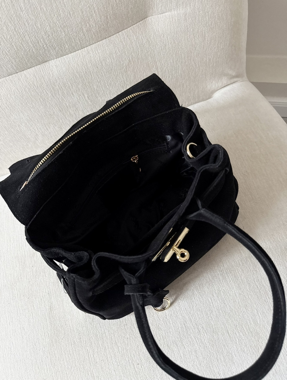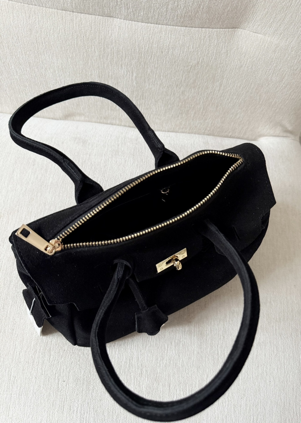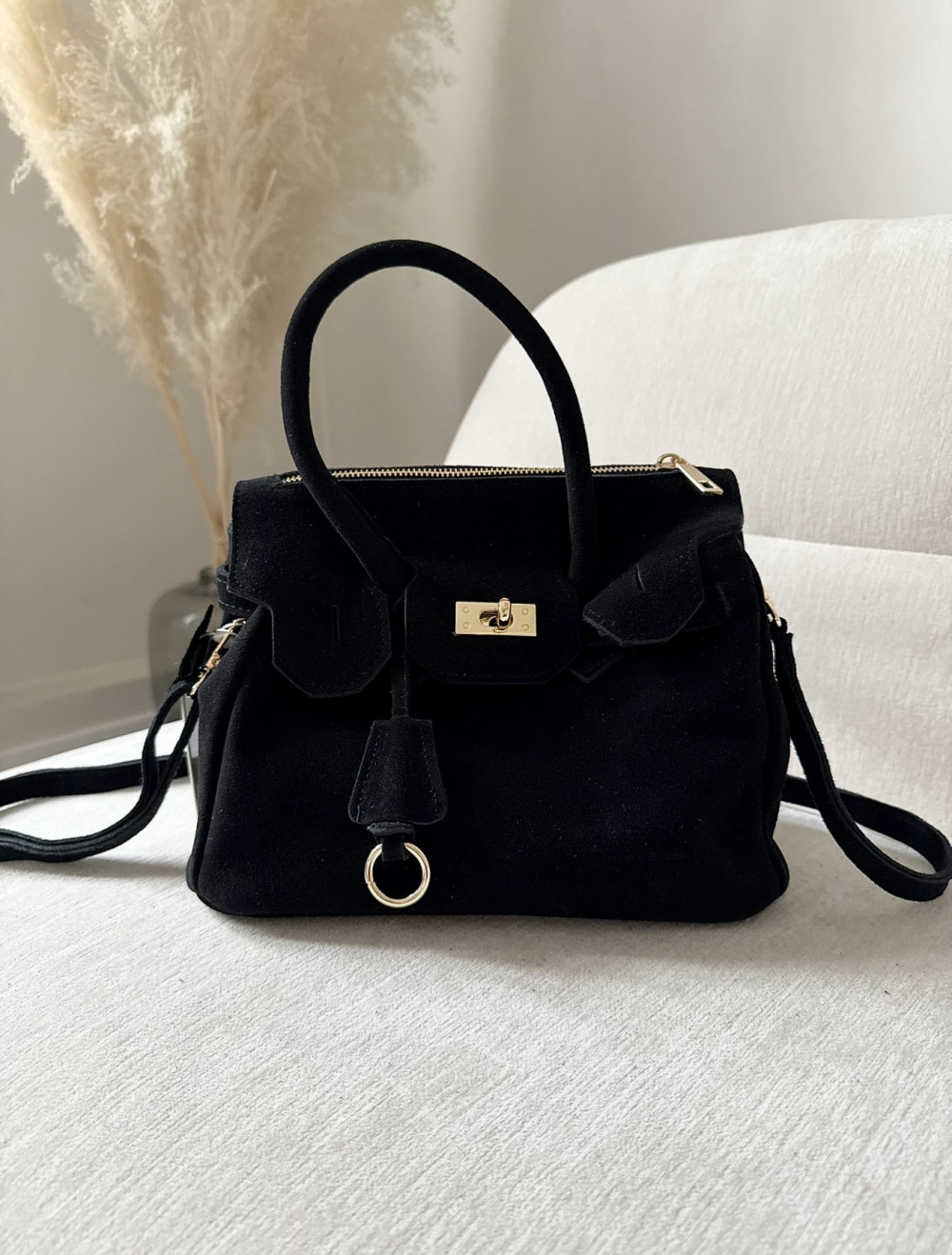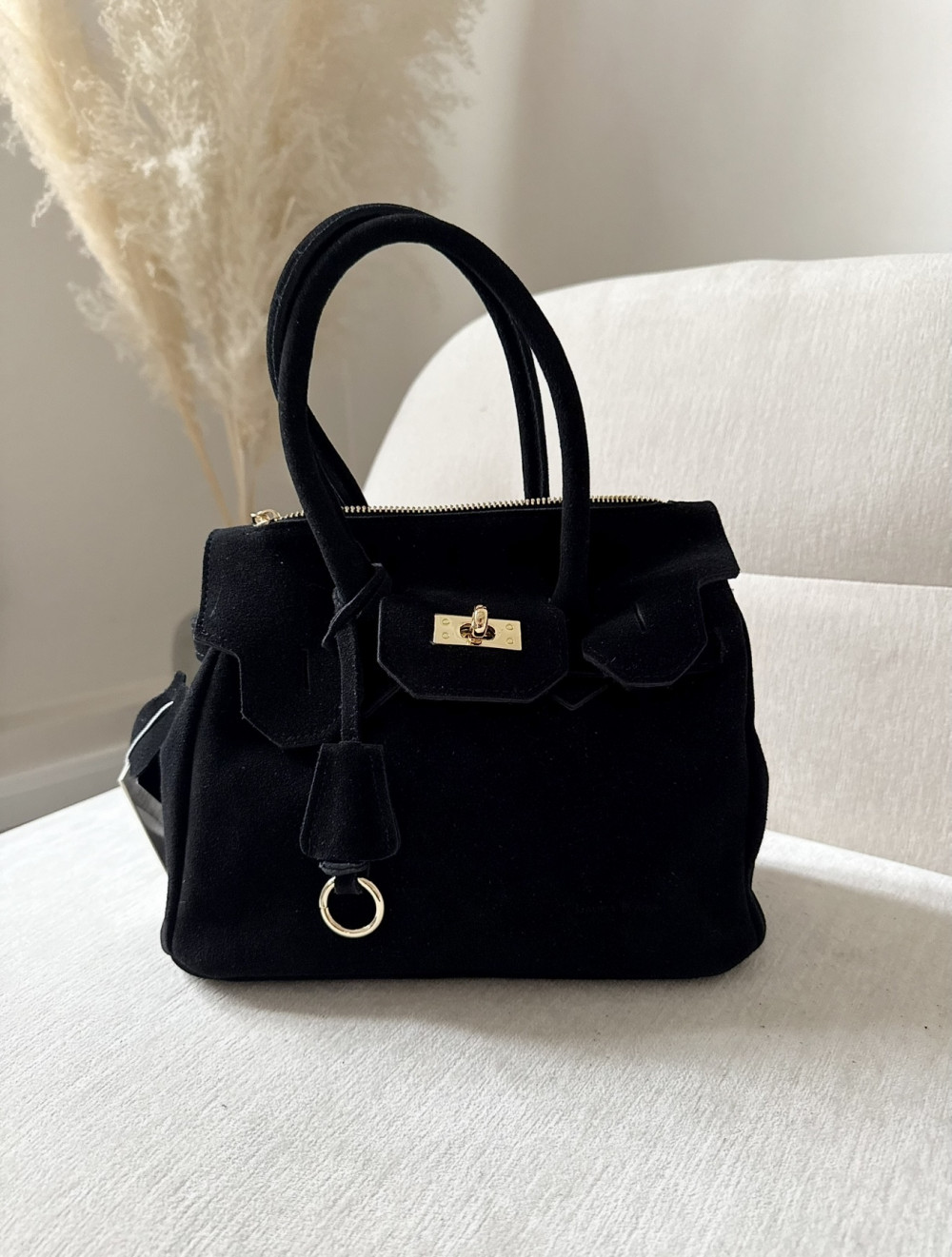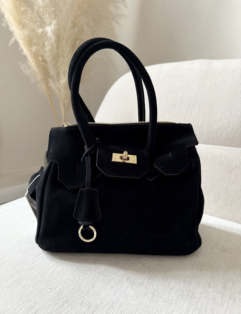 Torebka Laura Biaggi Hermina to elegancki model inspirowany ponadczasową klasyką i luksusowym stylem. Wykonana z wysokiej jakości skóry zamszowej w głębokim, czarnym kolorze, zachwyca minimalistyczną formą i subtelnym połyskiem złotych detali.
