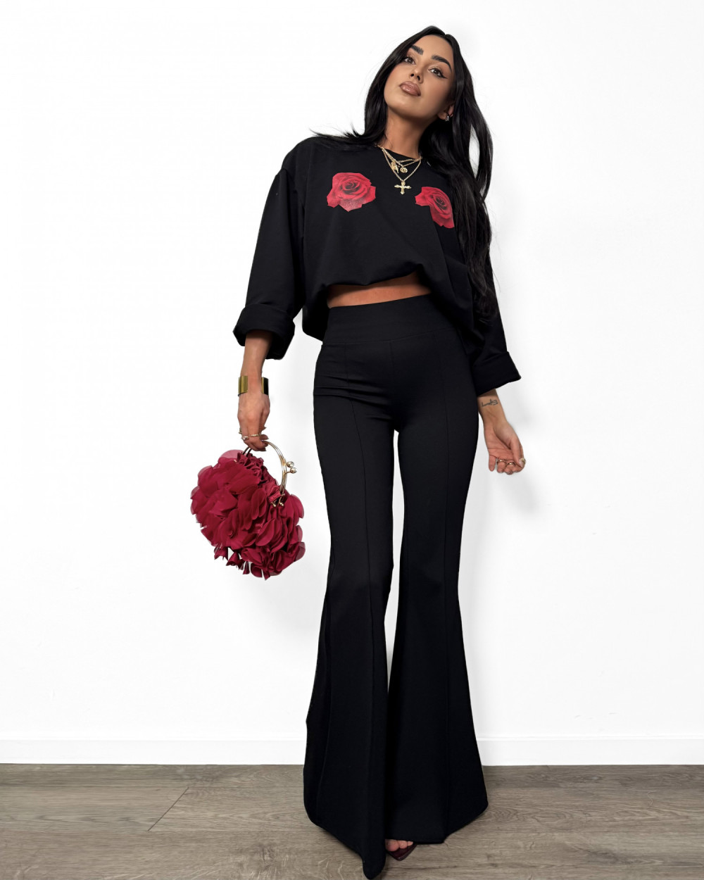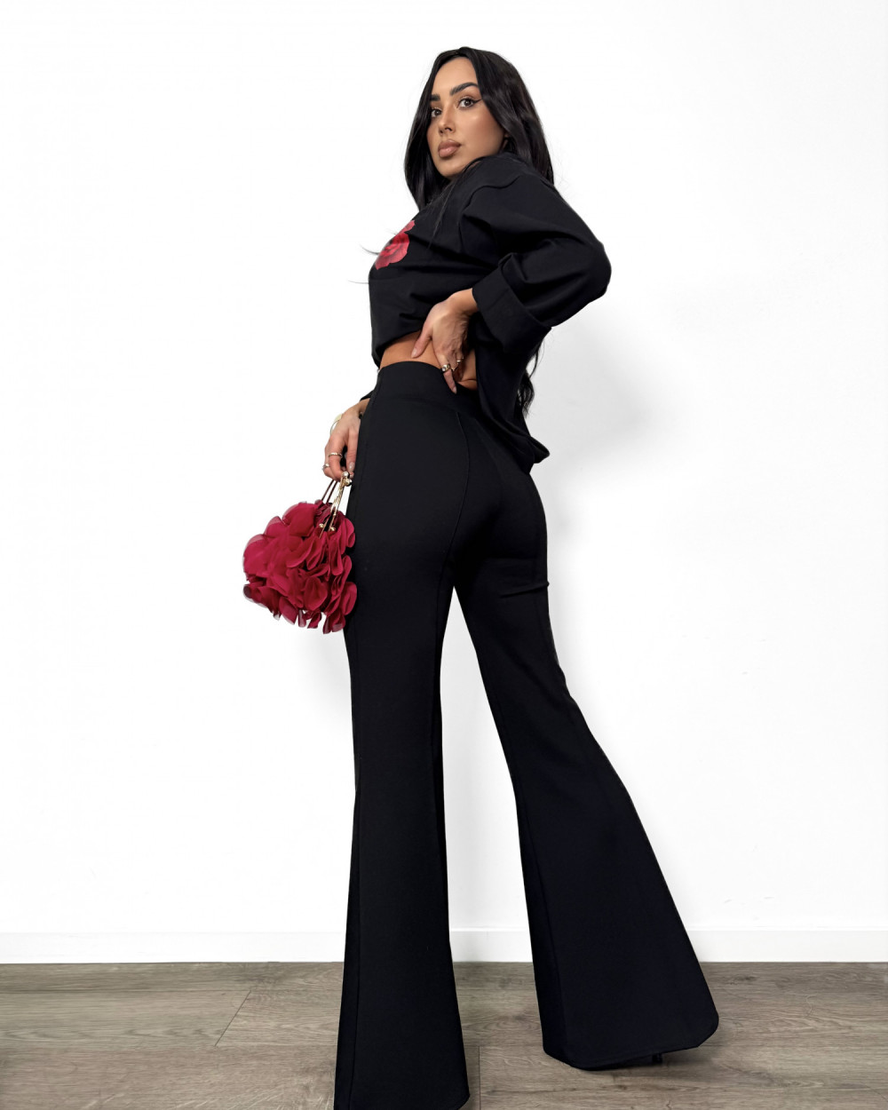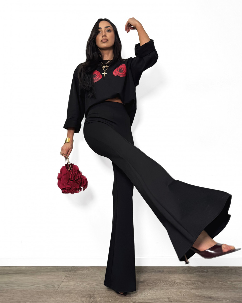 Model posiada wysoki stan, który zapewnia komfort i subtelne wymodelowanie talii. Rozszerzane nogawki w stylu dzwonów dodają lekkości i idealnie współgrają zarówno z obcasami, jak i masywniejszym obuwiem. To spodnie, które doskonale sprawdzą się w codziennych stylizacjach oraz na wieczorne wyjścia.
