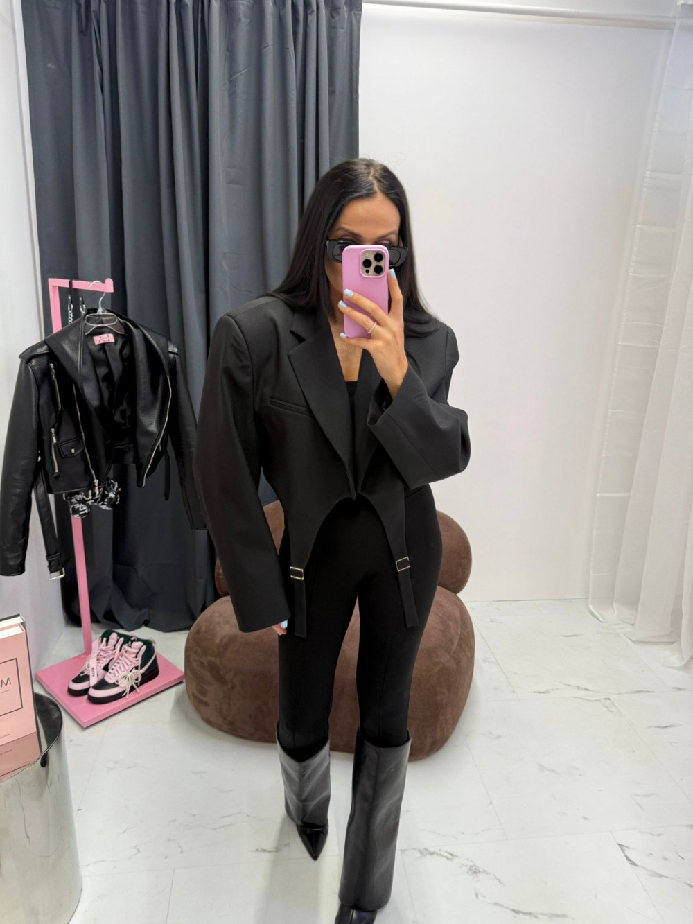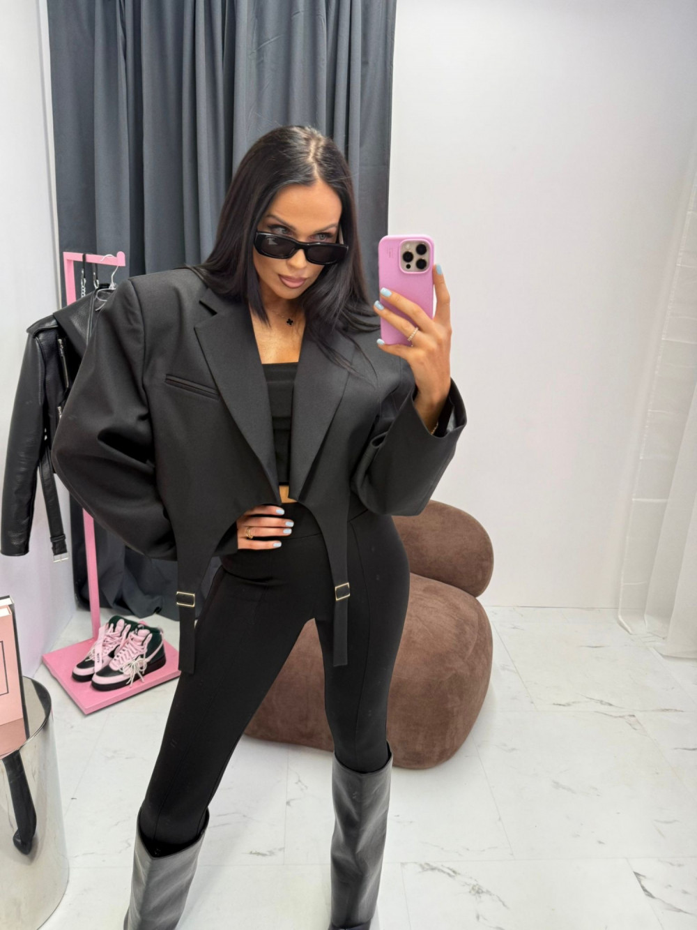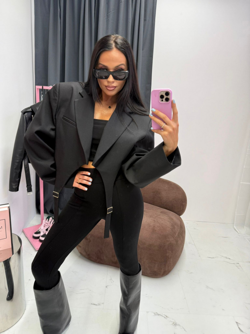 Czarna marynarka z troczkami La Milla to nowoczesne połączenie klasyki i wyrazistego charakteru. Jej oversize’owy fason z mocno zarysowanymi ramionami, dzięki wszytym poduszkom, pięknie podkreśla sylwetkę i nadaje całości modowej pewności siebie. Przód zdobią efektowne, długie troczki, które tworzą niepowtarzalny detal i pozwalają na subtelne modelowanie formy marynarki.
