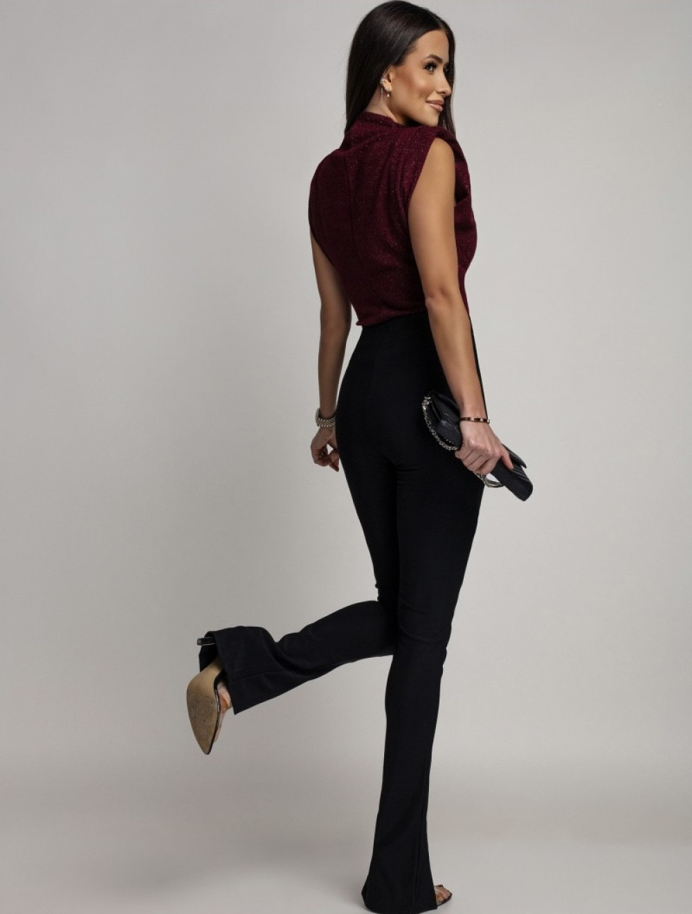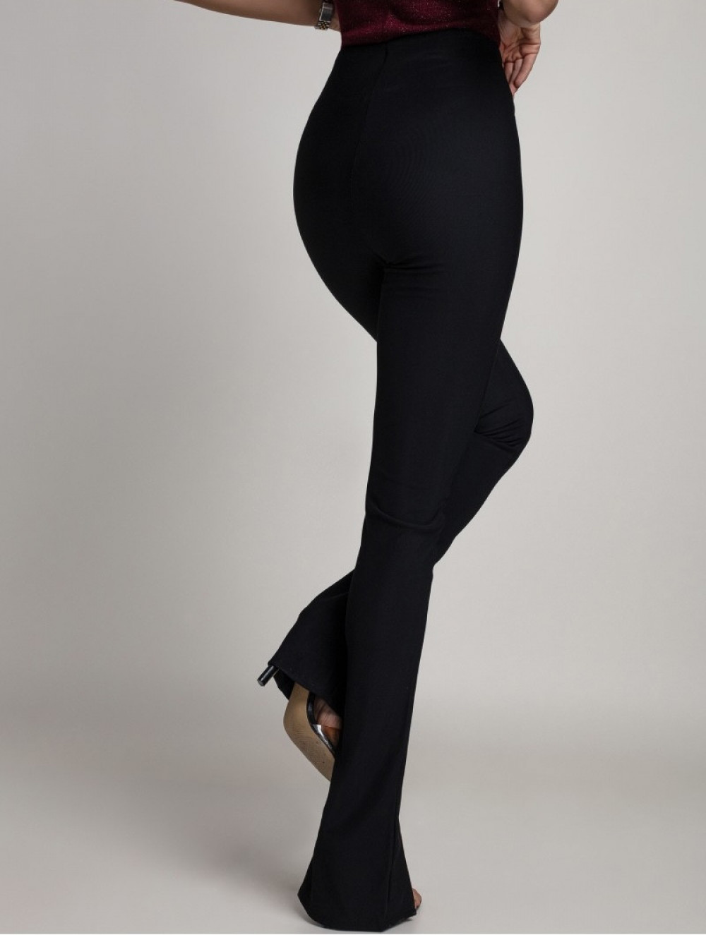 Czarne legginsy o wysokim stanie i dopasowanej linii subtelnie podkreślają sylwetkę, modelując biodra i talię z elegancją i lekkością. Elastyczna tkanina dopasowuje się do ciała, zachowując komfort noszenia. Rozcięcia z przodu nogawek dodają nowoczesnego charakteru i optycznie wydłużają nogi, tworząc efekt idealny do butów na obcasie oraz stylizacji wieczorowych.