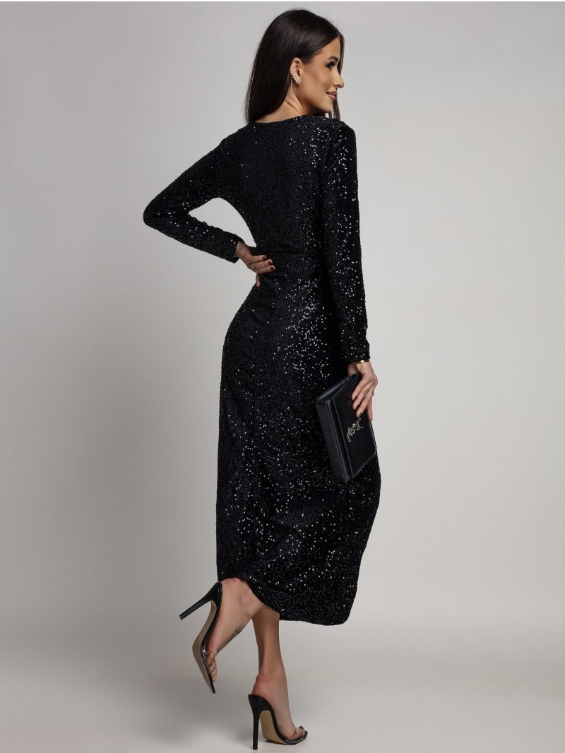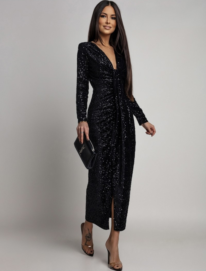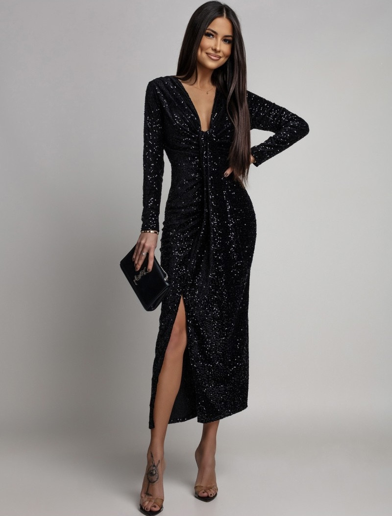 Czarna sukienka maxi z połyskującymi cekinami i głębokim dekoltem
