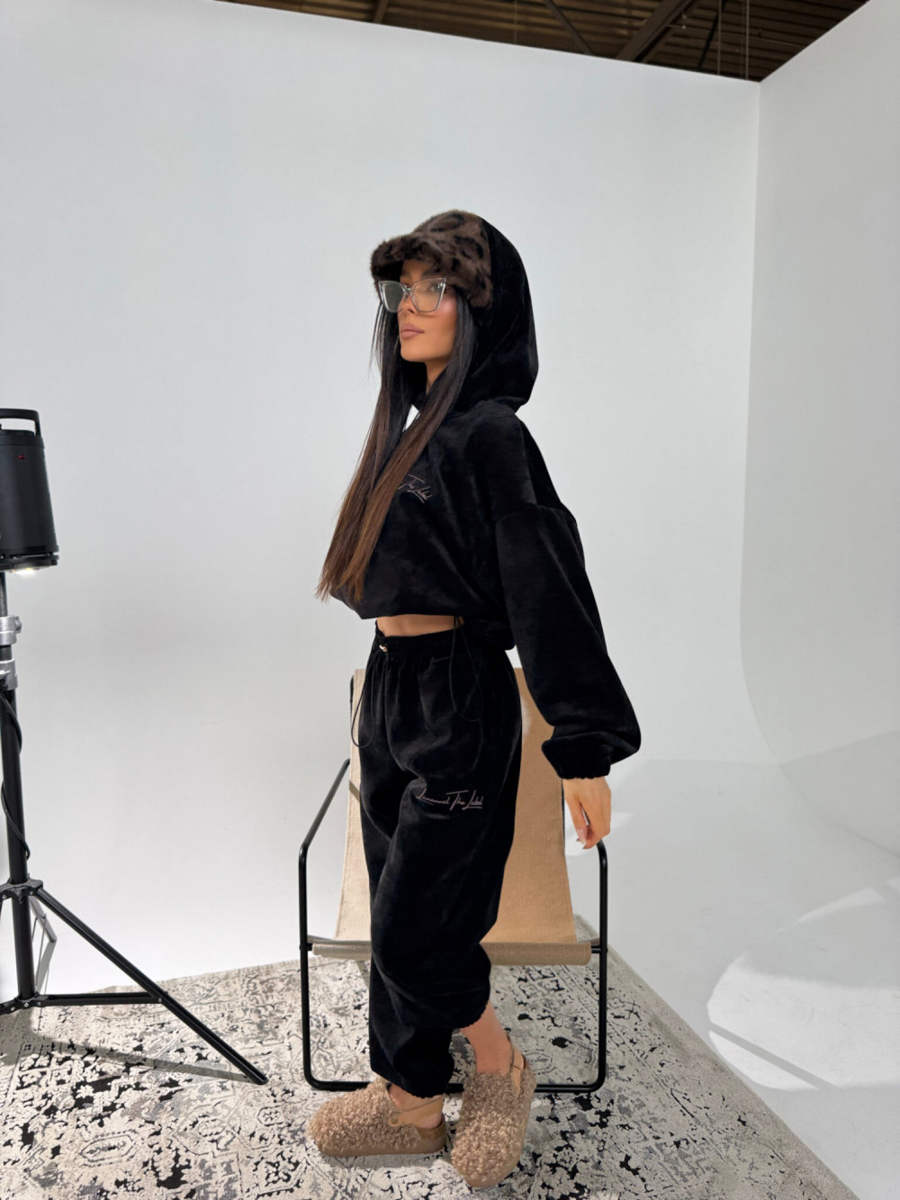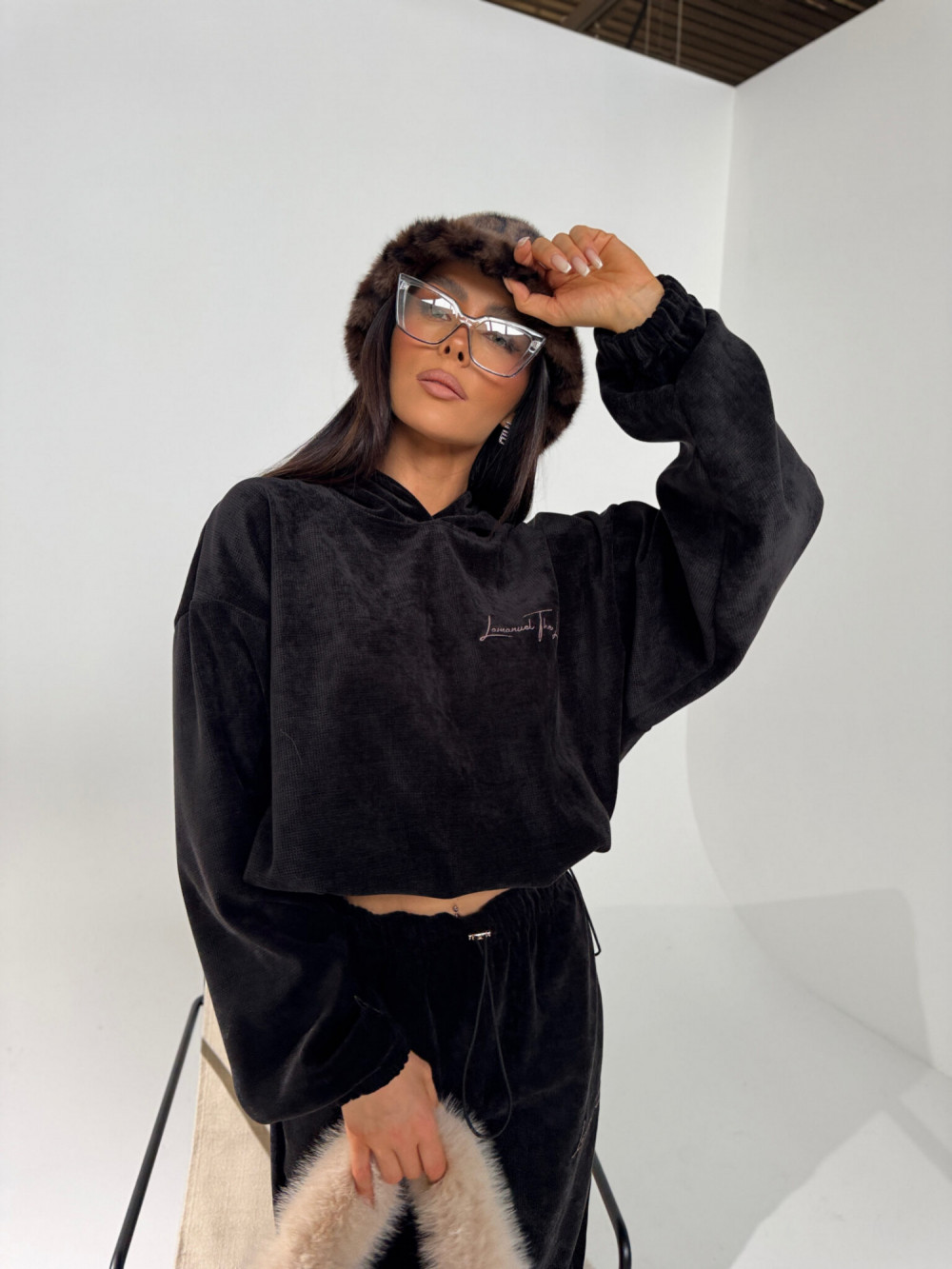 Komplet welurowy w kolorze czarnym to połączenie miękkości, wygody i stylu, które idealnie wpisuje się w zimowy klimat. Bluza o swobodnym kroju, z miękkim kapturem i możliwością regulacji dołu, pozwala dopasować fason do nastroju – noszona luźno daje codzienny komfort, a ściągnięta podkreśla proporcje sylwetki. Welurowa faktura subtelnie odbija światło, dodając całości elegancji w bardzo nieformalnym wydaniu.