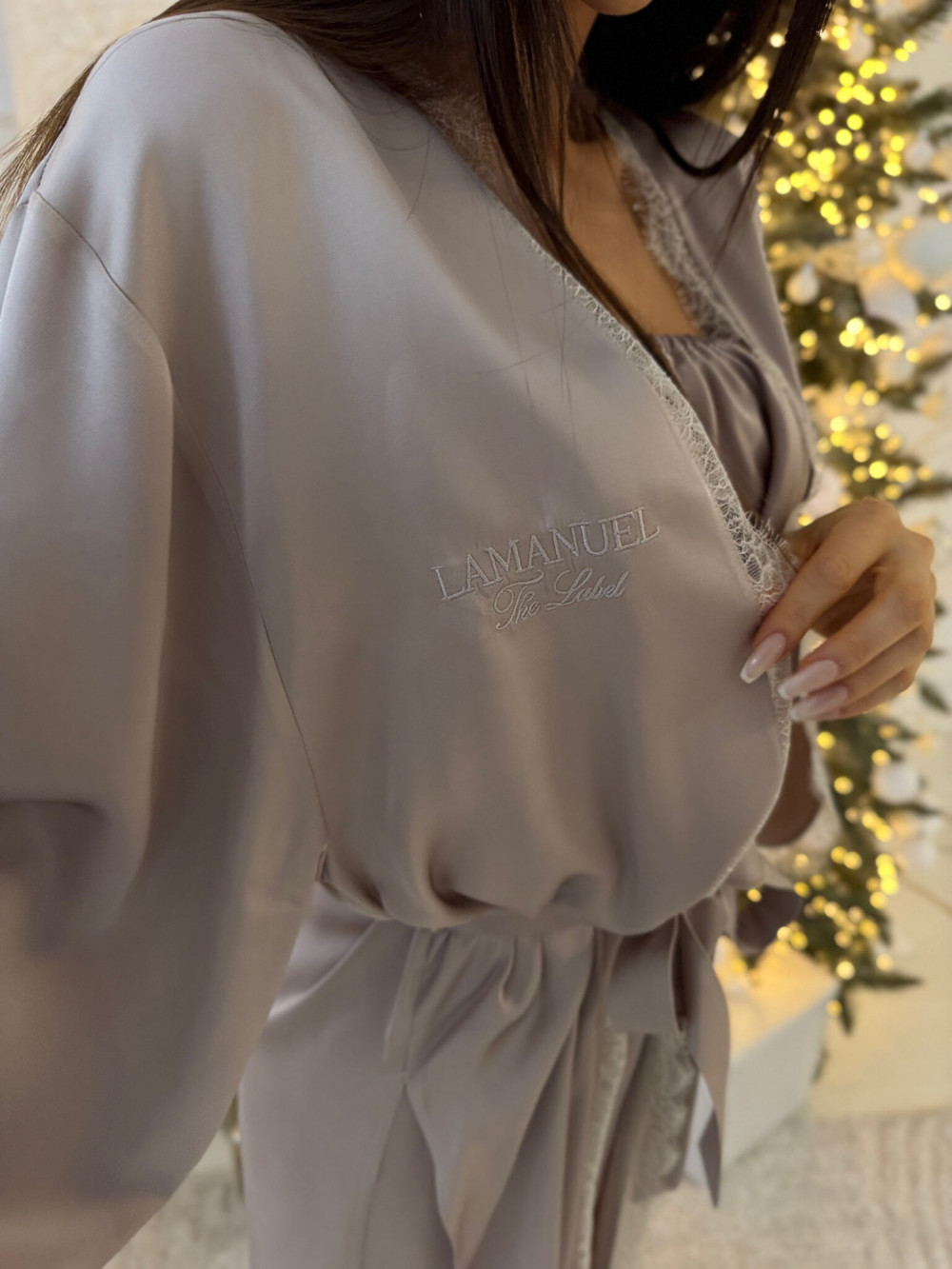 Luźny, elegancki krój z szerokimi rękawami nadaje całości swobodnej formy, a wiązanie w talii pozwala na indywidualne dopasowanie. Delikatna koronka wykańczająca dekolt i mankiety wprowadza subtelny akcent zmysłowości, który równoważy minimalistyczną linię szlafroka. Haftowane logo LAMANUEL stanowi dyskretny detal, podkreślający charakter marki i dbałość o każdy element projektu.