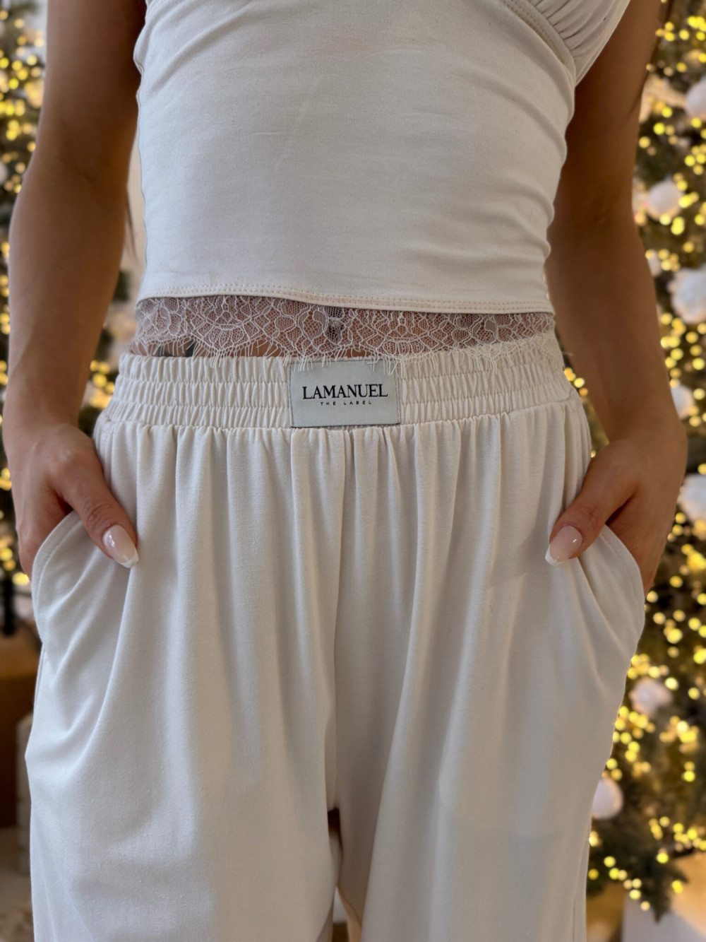 Top na cienkich ramiączkach z miękko układającym się dekoltem został wykończony subtelną koronką, która dodaje całości zmysłowości, nie tracąc przy tym klasy. Luźne spodnie z elastyczną talią idealnie dopasowują się do figury, gwarantując wygodę przez cały dzień i noc. Delikatne detale oraz metka LAMANUEL są wyraźnym symbolem jakości premium i dopracowania w każdym elemencie.