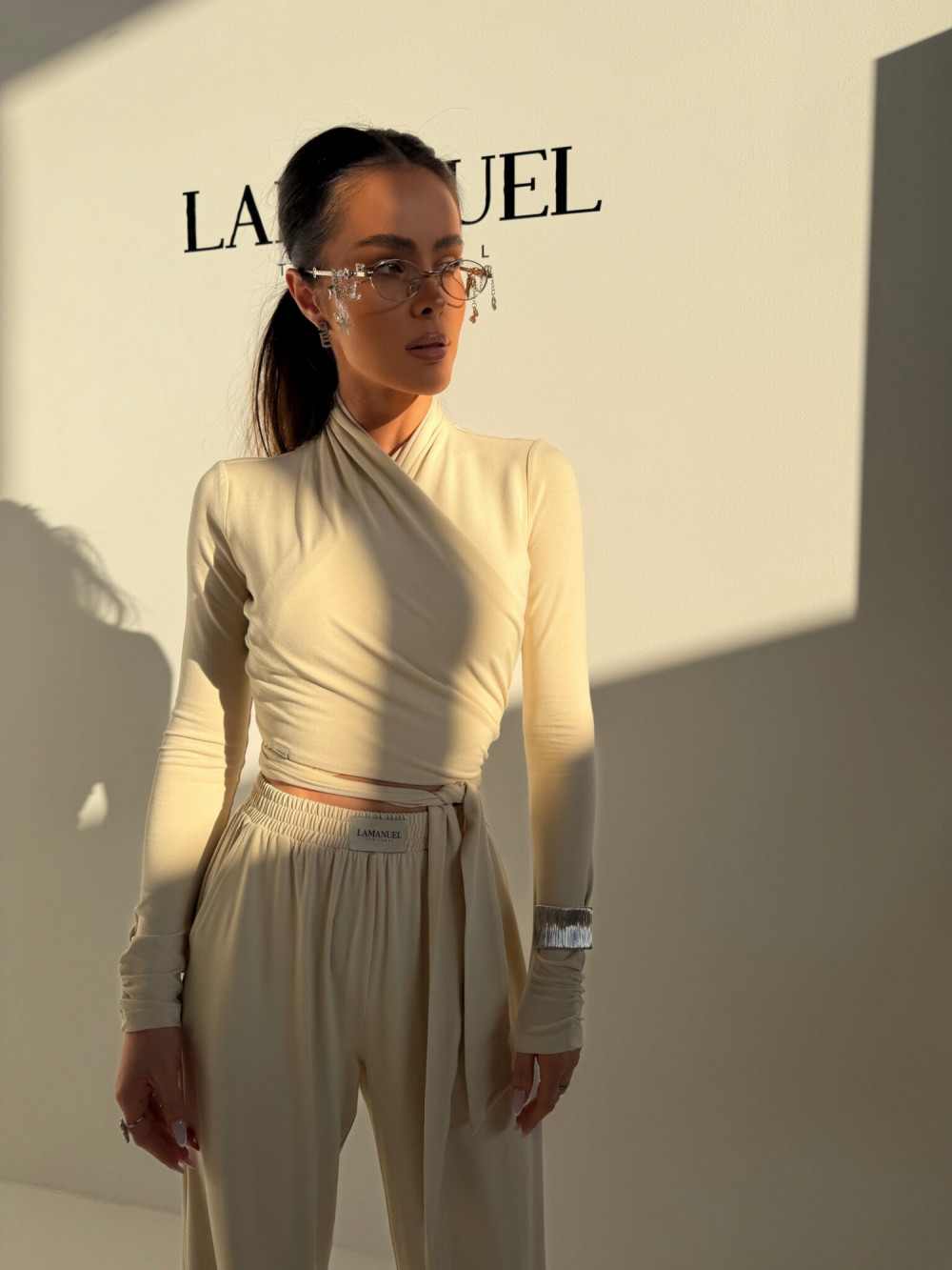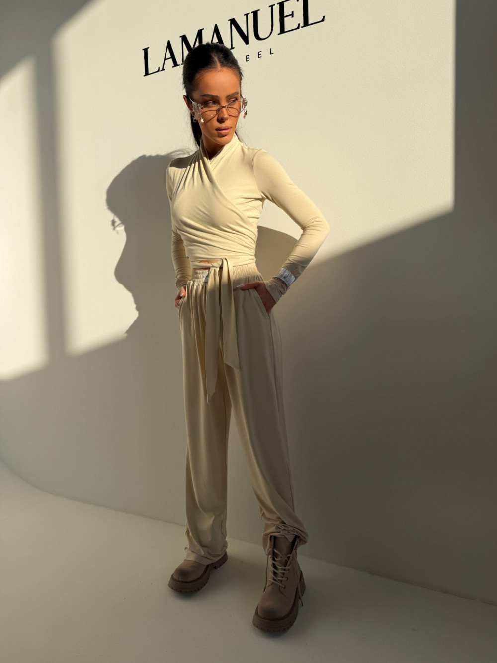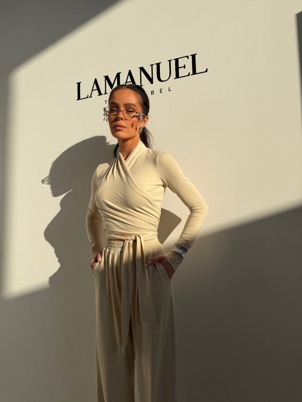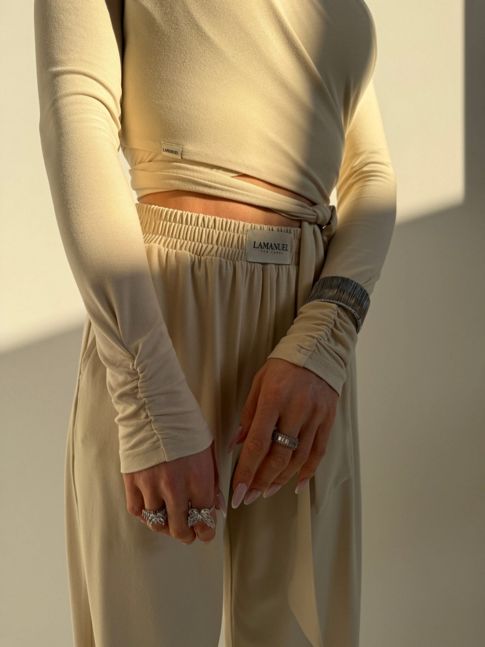 Stylowy komplet z miękkiej, elastycznej wiskozy, który łączy komfort noszenia z kobiecym wykończeniem. Dopasowany top pięknie podkreśla sylwetkę, a krzyżowe wiązanie pozwala nosić go na dwa sposoby — blisko szyi lub z dekoltem w kształcie litery V. Delikatnie marszczone rękawy dodają lekkości i subtelnej elegancji. Luźne spodnie z prostą nogawką zostały wykończone elastyczną gumą w pasie i wyposażone w praktyczne kieszenie, dzięki czemu gwarantują wygodę przez cały dzień. Przyjemny w dotyku materiał doskonale układa się na ciele, tworząc harmonijną całość. Subtelne metki La Manuel na topie i spodniach podkreślają minimalistyczny charakter zestawu. To komplet, który sprawdzi się zarówno w codziennych stylizacjach, jak i w bardziej dopracowanych lookach — nowoczesny, uniwersalny i niezwykle komfortowy.