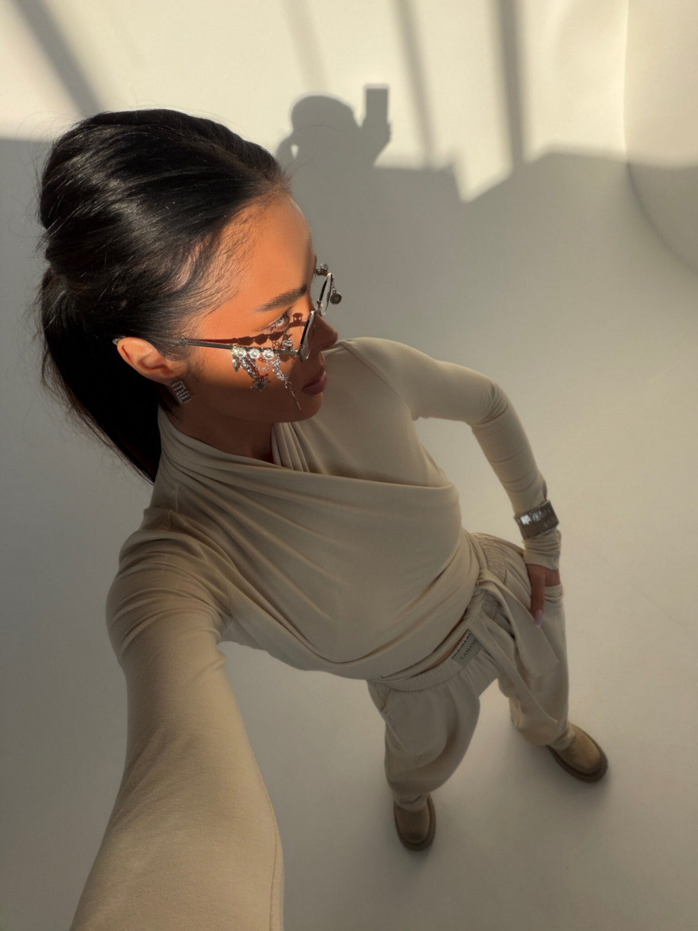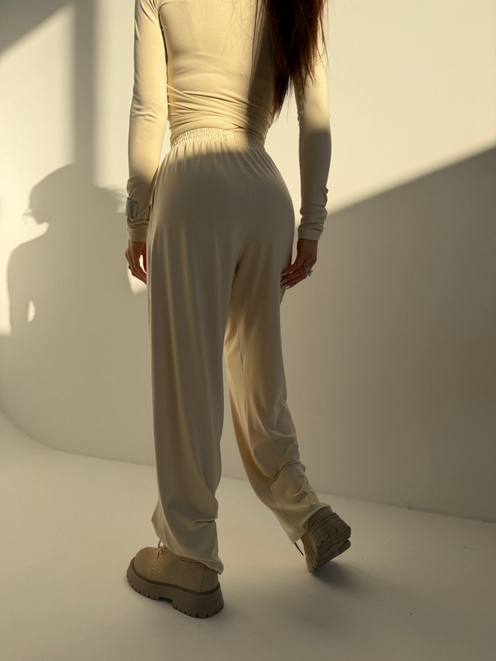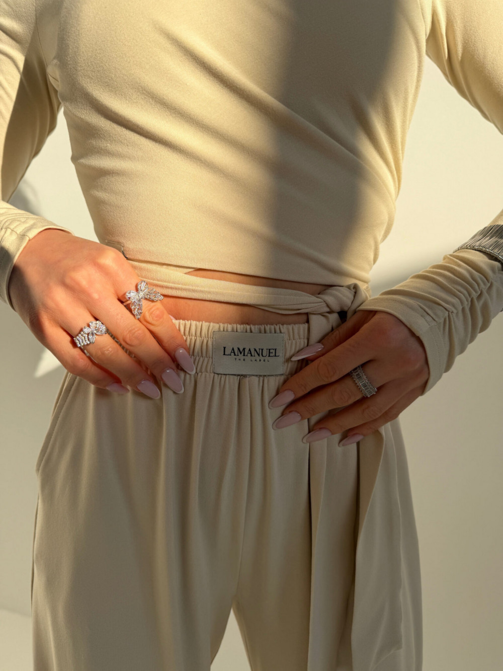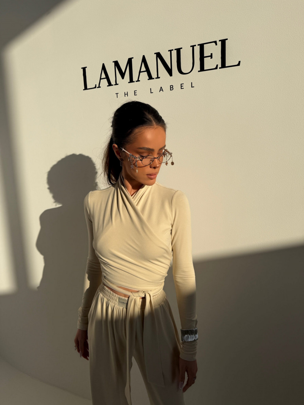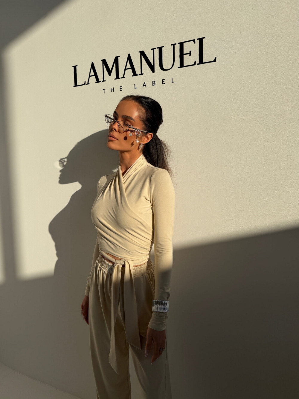 Stylowy komplet z miękkiej, elastycznej wiskozy, który łączy komfort noszenia z kobiecym wykończeniem. Dopasowany top pięknie podkreśla sylwetkę, a krzyżowe wiązanie pozwala nosić go na dwa sposoby — blisko szyi lub z dekoltem w kształcie litery V. Delikatnie marszczone rękawy dodają lekkości i subtelnej elegancji. Luźne spodnie z prostą nogawką zostały wykończone elastyczną gumą w pasie i wyposażone w praktyczne kieszenie, dzięki czemu gwarantują wygodę przez cały dzień. Przyjemny w dotyku materiał doskonale układa się na ciele, tworząc harmonijną całość. Subtelne metki La Manuel na topie i spodniach podkreślają minimalistyczny charakter zestawu. To komplet, który sprawdzi się zarówno w codziennych stylizacjach, jak i w bardziej dopracowanych lookach — nowoczesny, uniwersalny i niezwykle komfortowy.