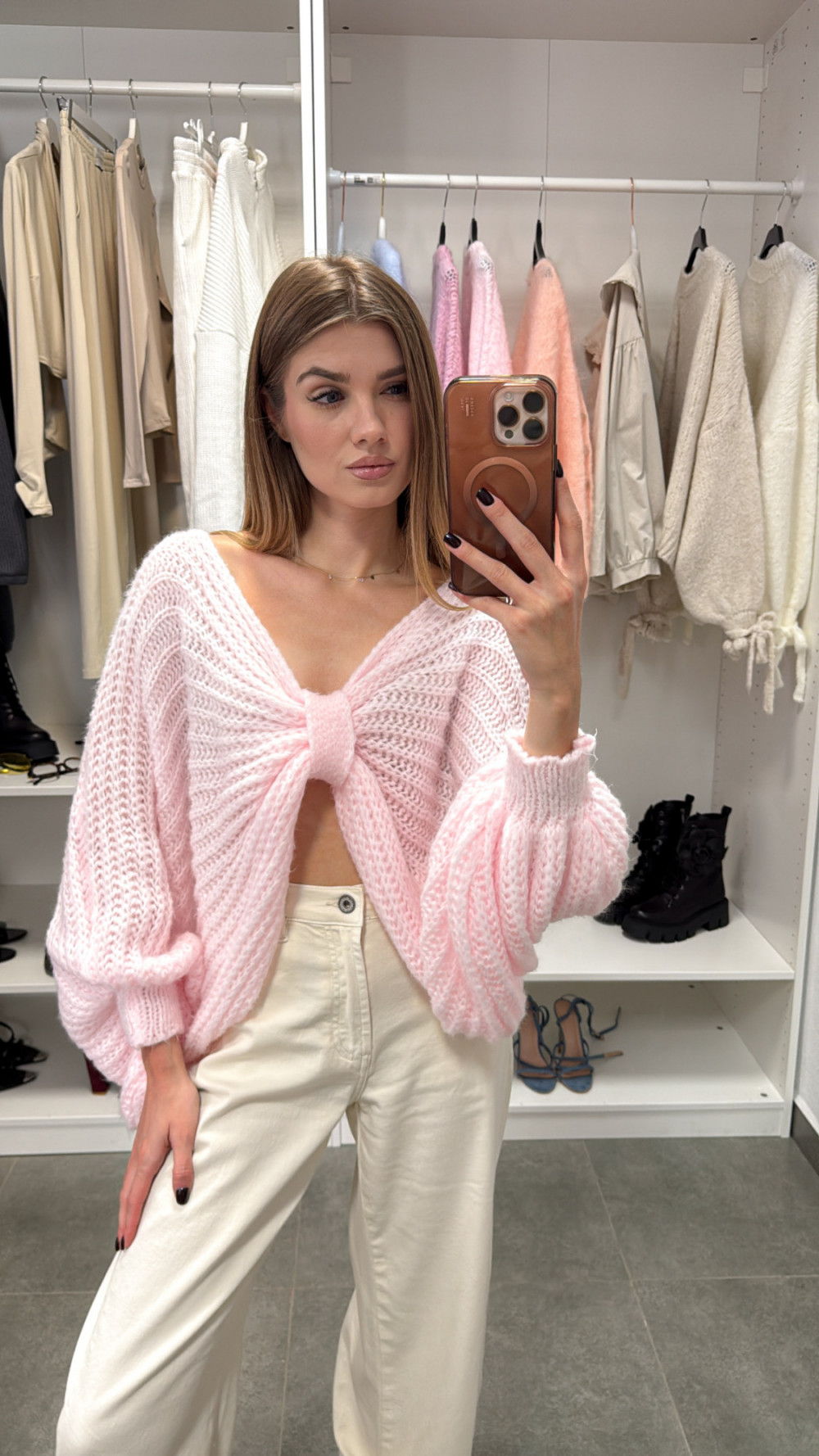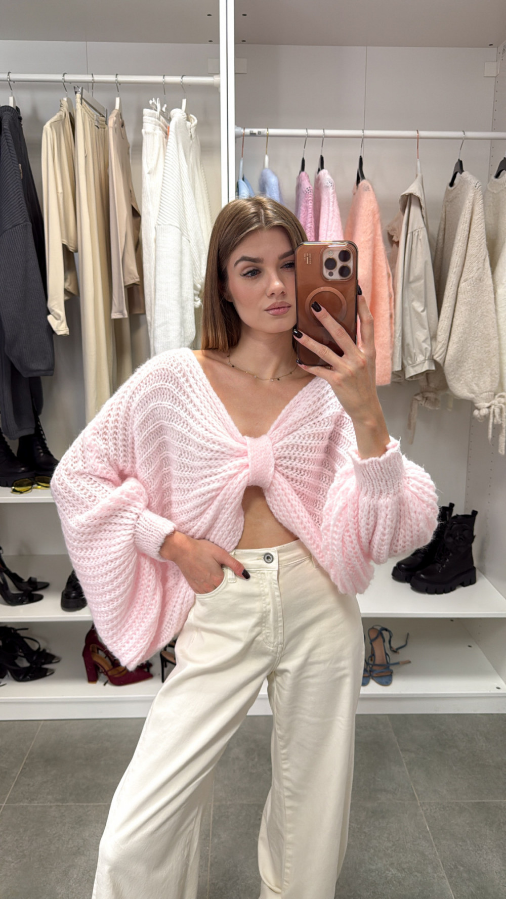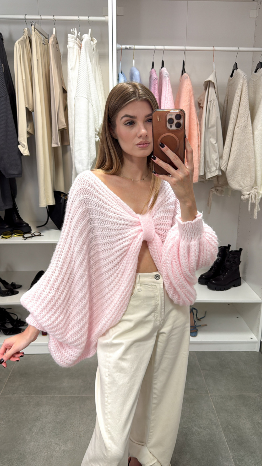 Sweter damski MUSE w odcieniu pudrowego różu to wyjątkowy model typu 2w1, który możesz nosić na dwa sposoby — z wiązaniem z przodu lub z tyłu, w zależności od stylizacji i nastroju.