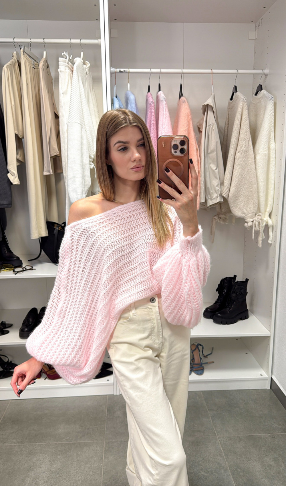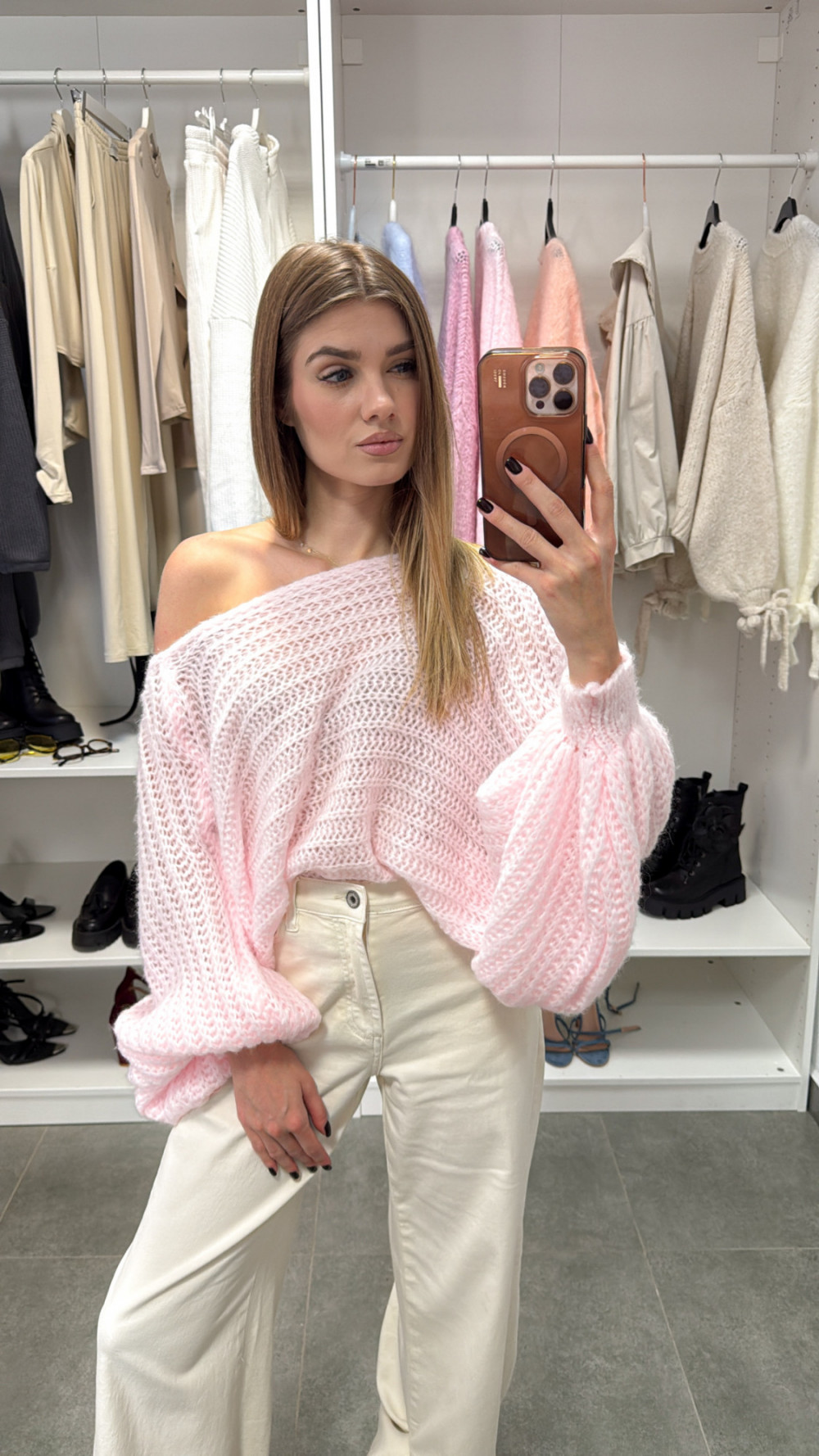 Model doskonale sprawdzi się zarówno w romantycznych zestawieniach, jak i w bardziej nowoczesnych stylizacjach z jasnymi spodniami lub spódnicą. Pudrowy róż dodaje świeżości i miękkiej elegancji, podkreślając delikatny charakter swetra.