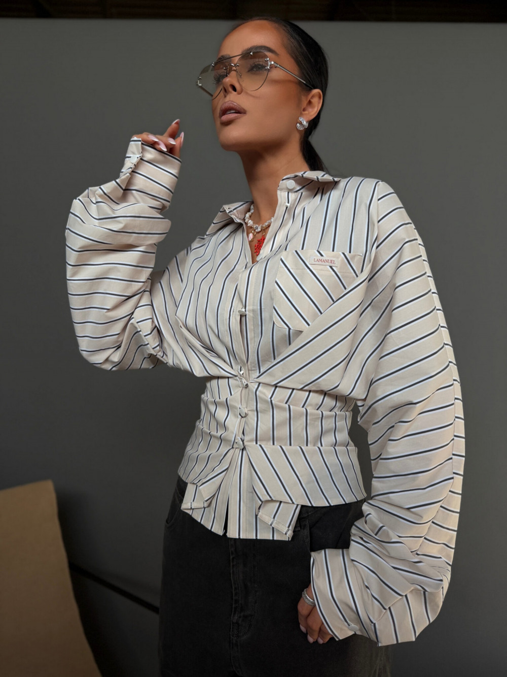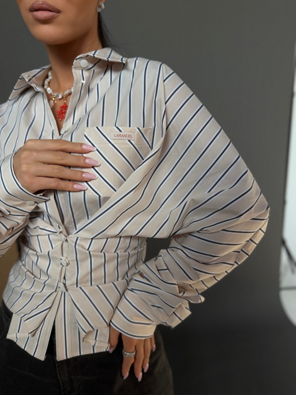 Beżowa koszula damska WHISPER La Manuel o luźnym kroju to ponadczasowa i uniwersalna propozycja, która łączy komfort z eleganckim, minimalistycznym stylem. Lekka tkanina w pionowe paski subtelnie układa się na sylwetce, nadając stylizacjom lekkości i harmonii.