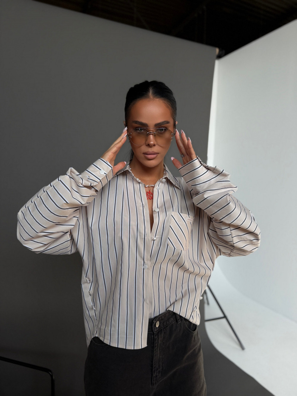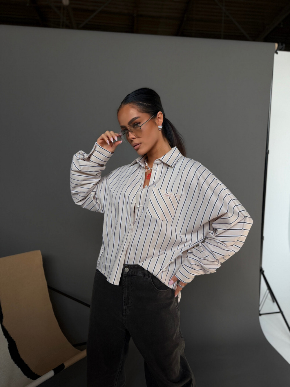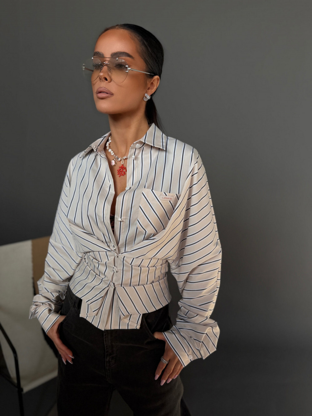 To model, który daje pełną swobodę stylizacji. Koszulę możesz nosić klasycznie – luźno, zapiętą na całej długości – lub w bardziej kobiecej wersji, zapinając tylko wybrane guziki i podkreślając talię. Jedna forma pozwala stworzyć zarówno swobodny, jak i bardziej dopracowany look.