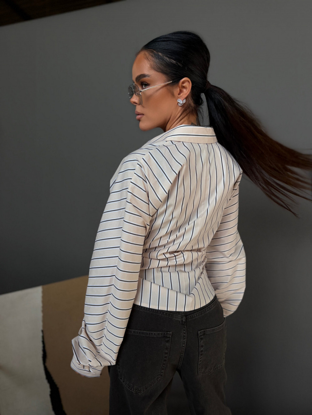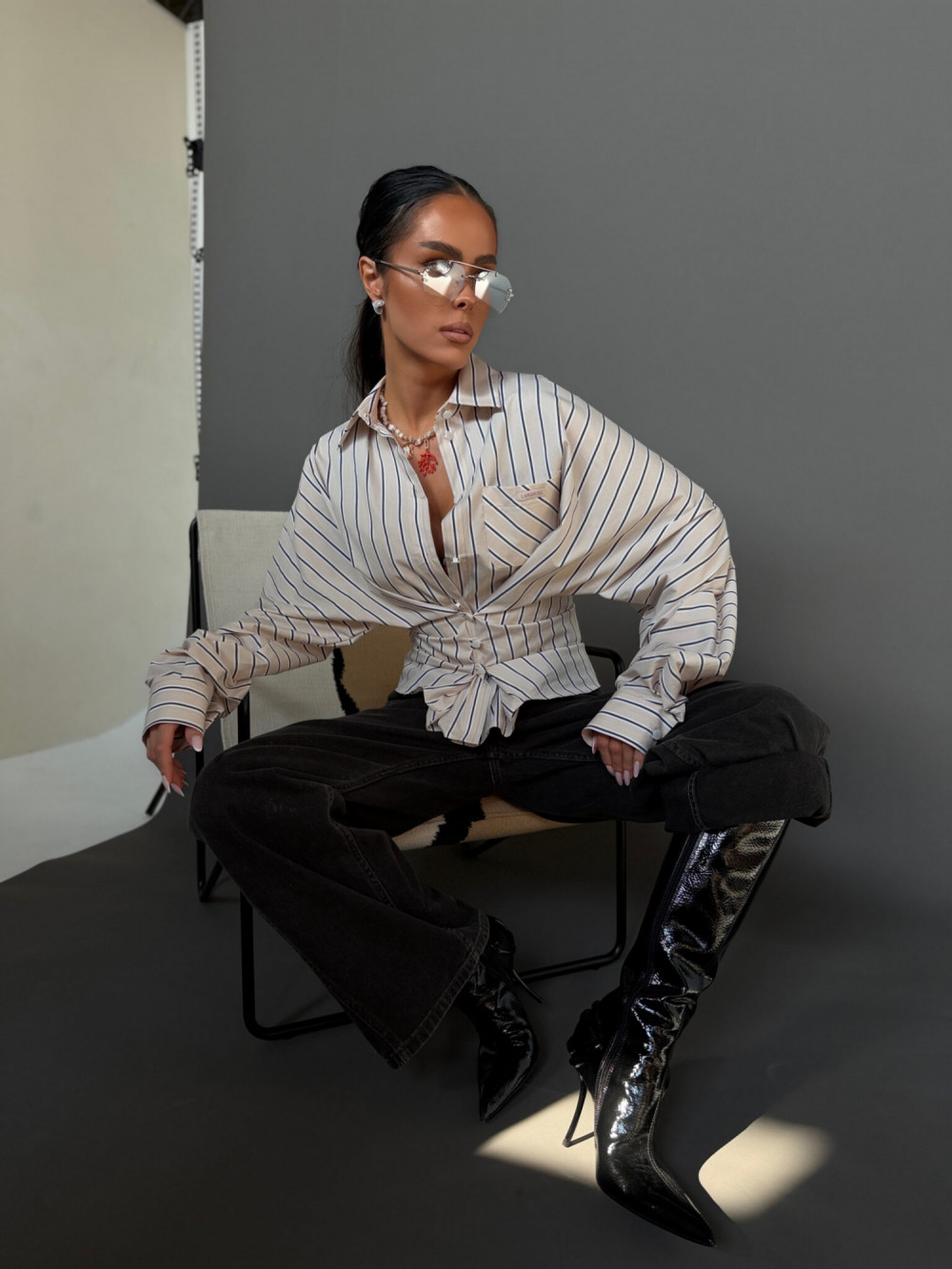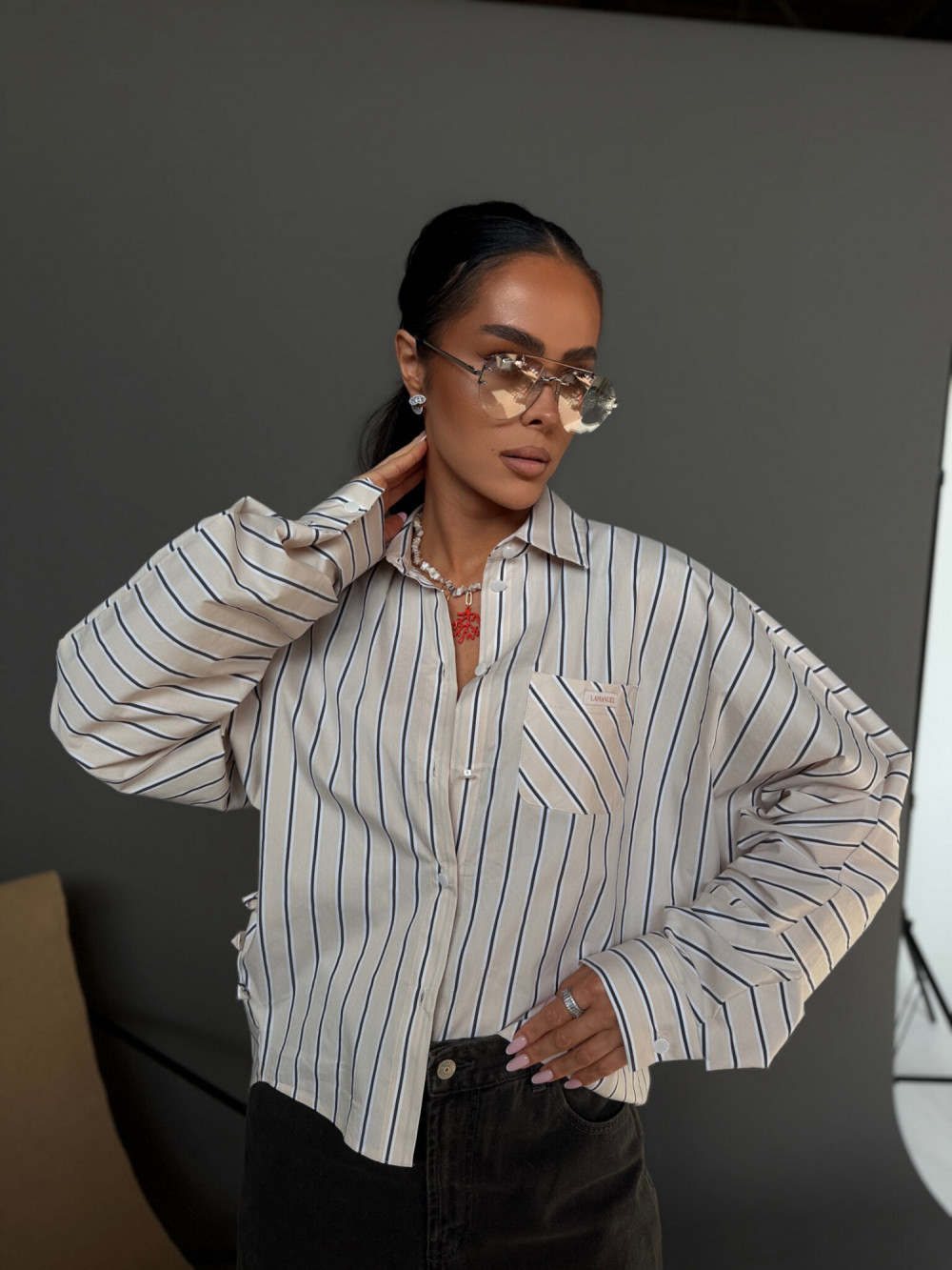 To model, który daje pełną swobodę stylizacji. Koszulę możesz nosić klasycznie – luźno, zapiętą na całej długości – lub w bardziej kobiecej wersji, zapinając tylko wybrane guziki i podkreślając talię. Jedna forma pozwala stworzyć zarówno swobodny, jak i bardziej dopracowany look.