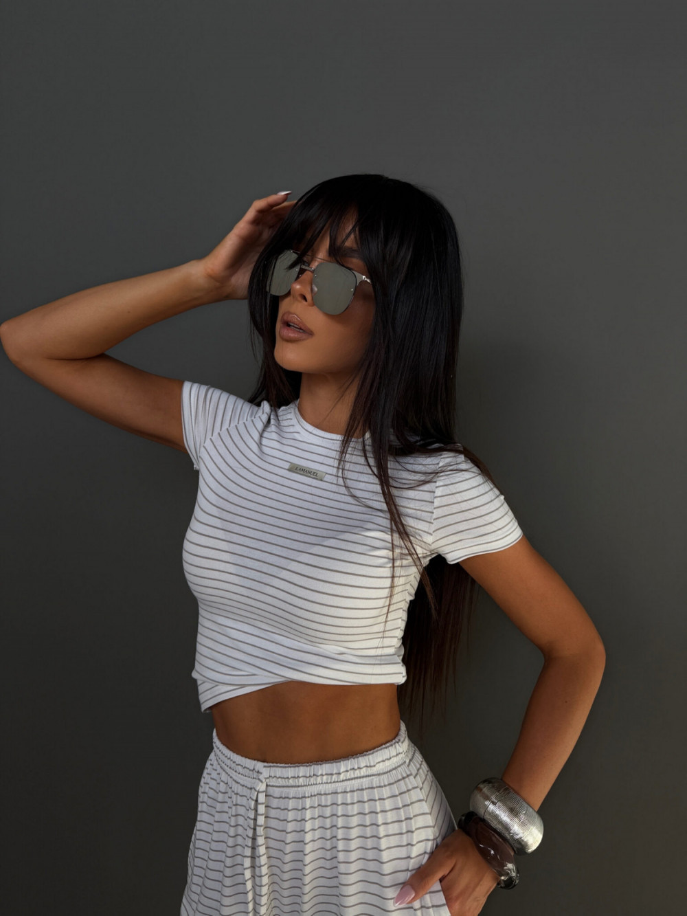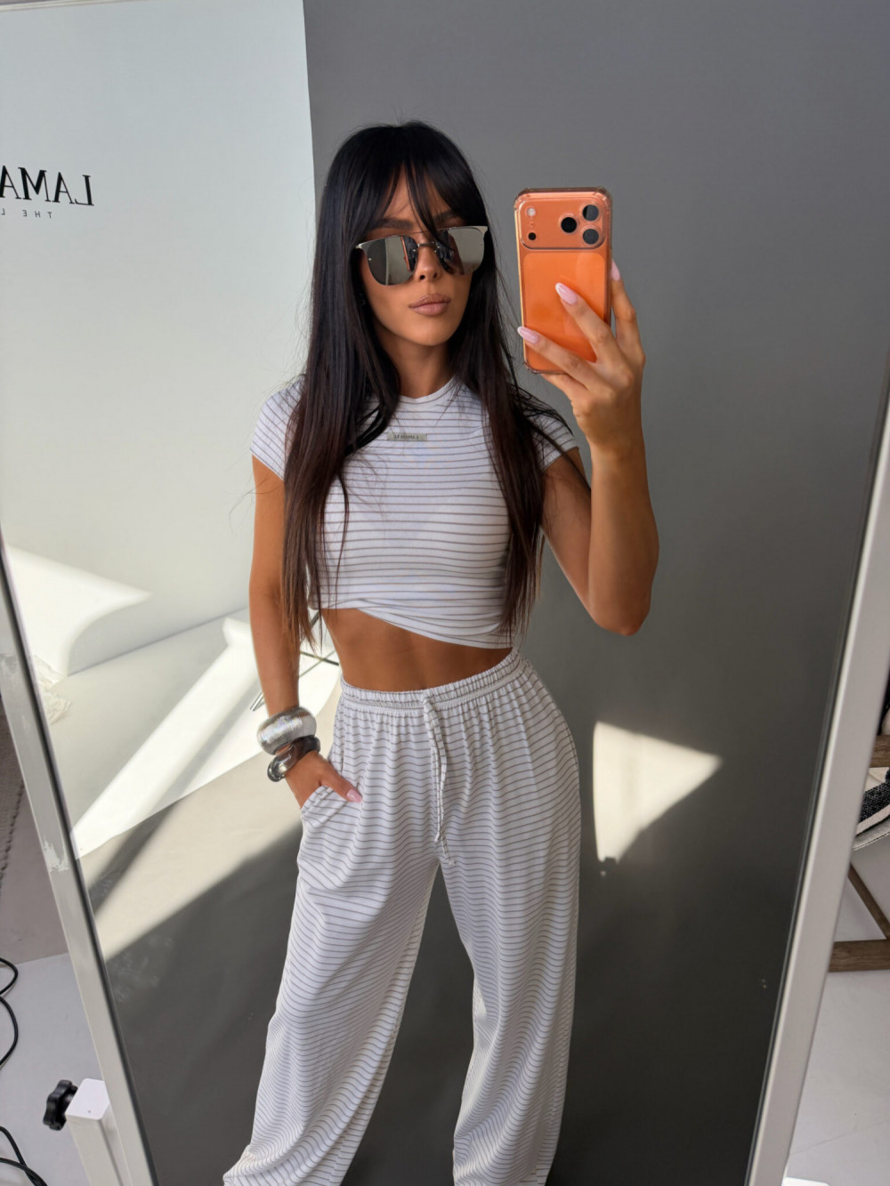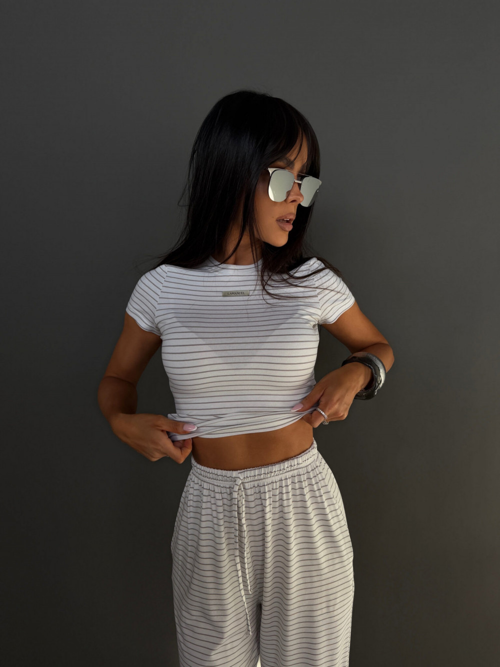 Komplet damski INSIDER w kolorze ecru to połączenie minimalizmu z subtelną elegancją. Jasna kolorystyka rozświetla stylizację i nadaje jej lekkości, a delikatne paski podkreślają casualowy charakter modelu.