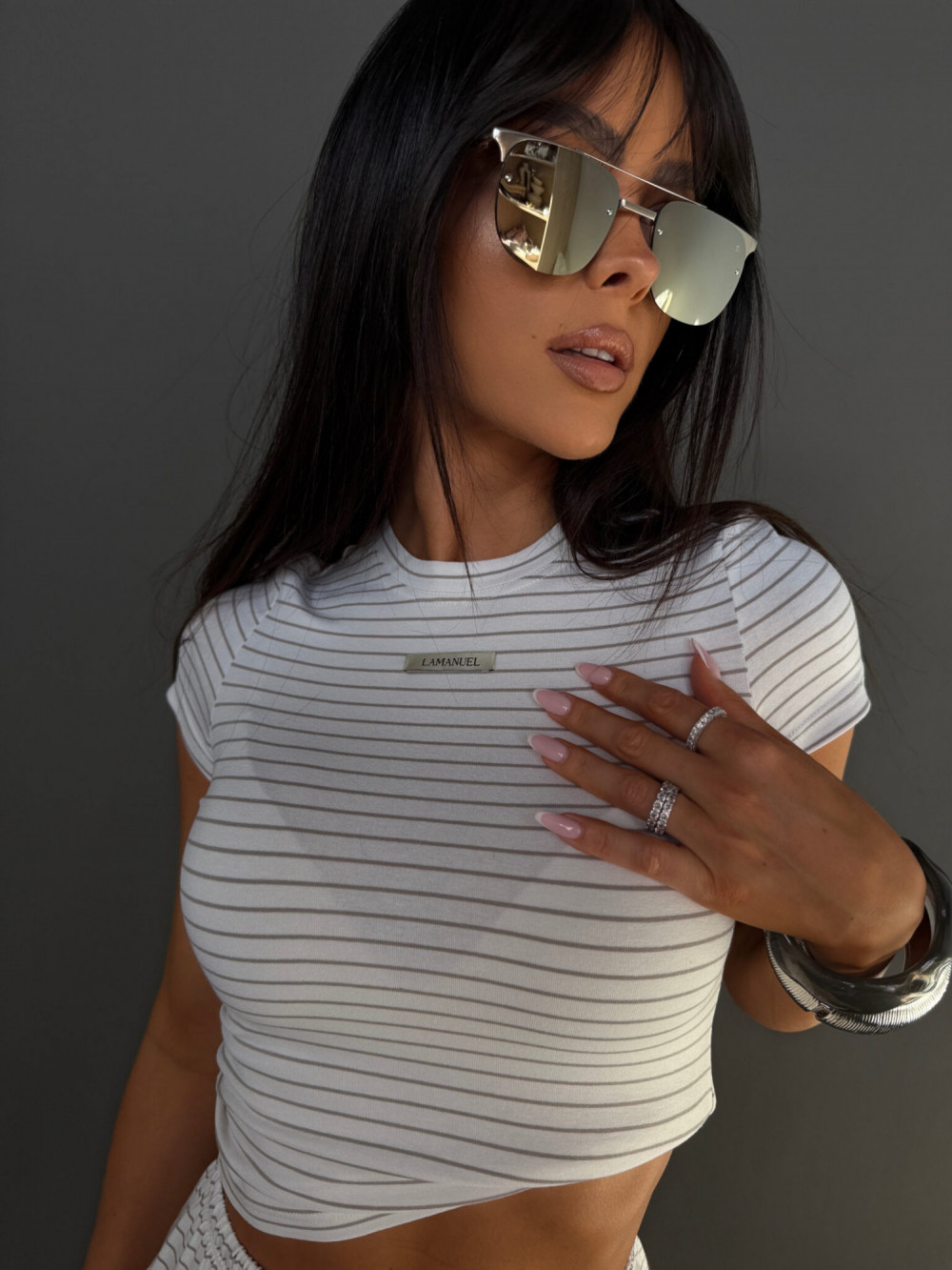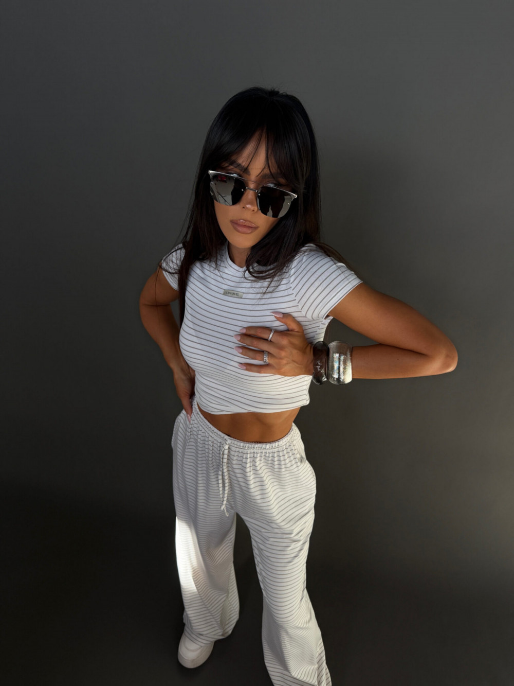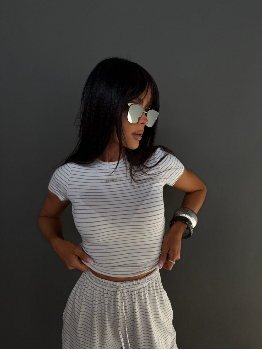 Komplet damski INSIDER w kolorze ecru to połączenie minimalizmu z subtelną elegancją. Jasna kolorystyka rozświetla stylizację i nadaje jej lekkości, a delikatne paski podkreślają casualowy charakter modelu.