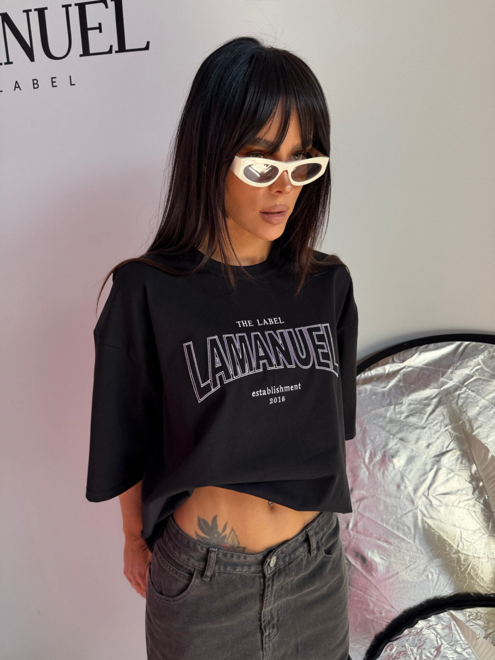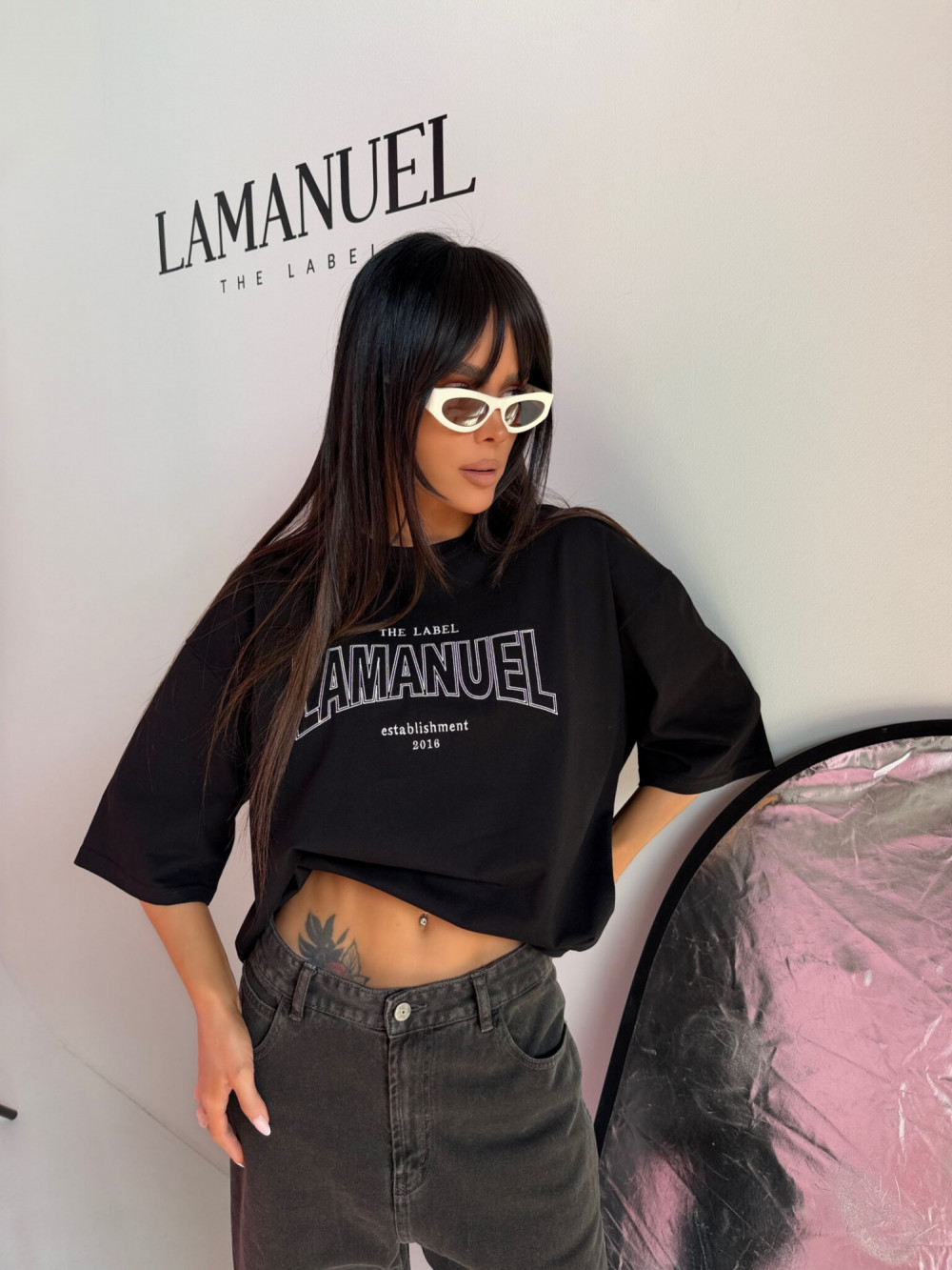Czarny t-shirt damski ADORA La Manuel to oversize’owy model z wysokiej jakości bawełny, który łączy wygodę z nowoczesnym, minimalistycznym stylem. Luźny fason i wydłużony rękaw zapewniają swobodę noszenia i świetnie układają się na sylwetce.