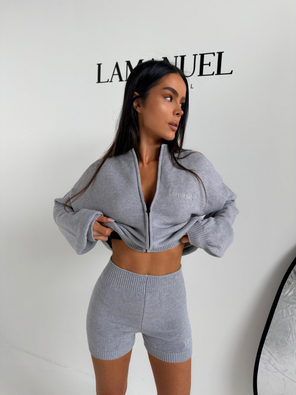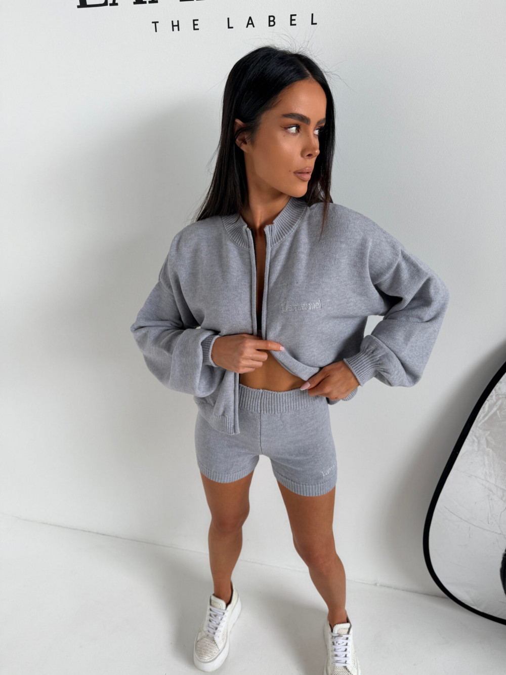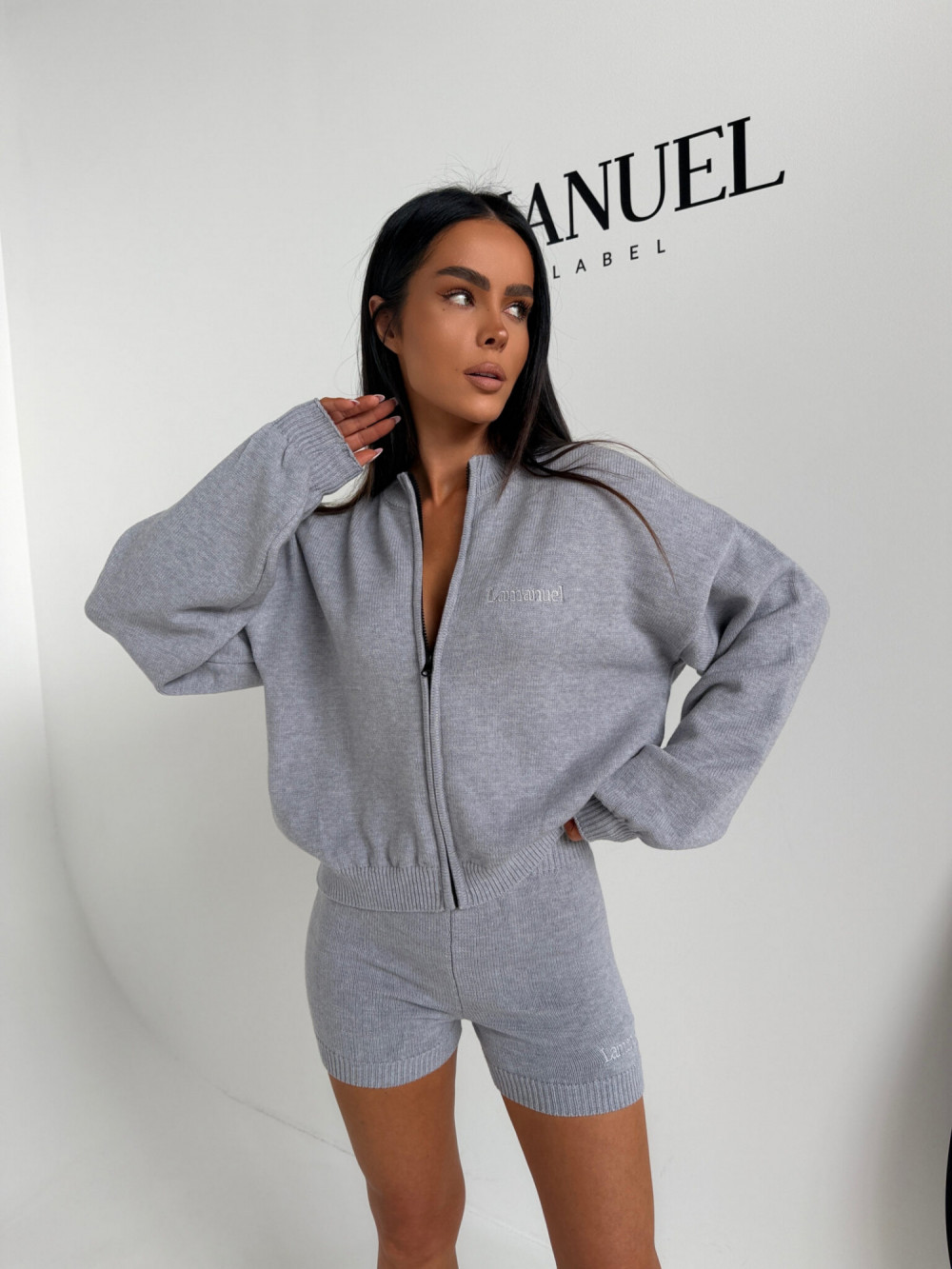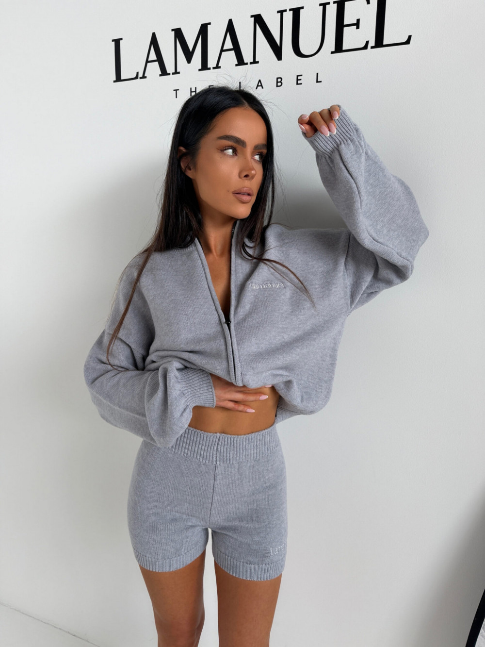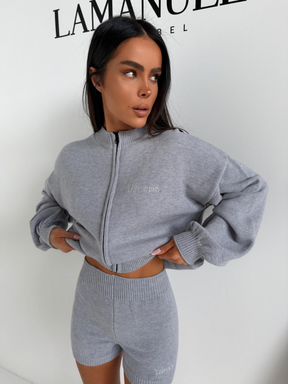 To komplet, który łączy wygodę z dopracowaną formą. Krótka bluza nadaje sylwetce lekkości, a szorty podkreślają talię i kształty, tworząc spójny i stylowy zestaw.